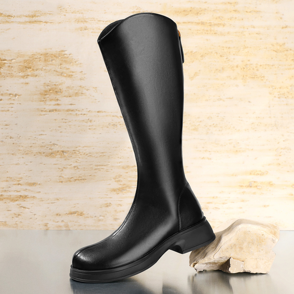 百丽真皮骑士靴女靴子英伦冬季黑色长筒靴加绒高长靴 336538