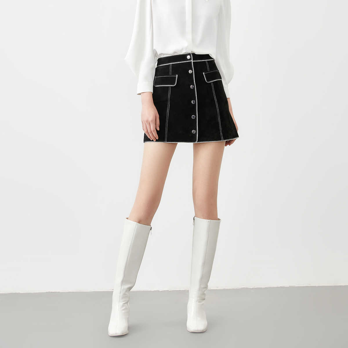 皮裙女猪剖层皮裙高腰A字假口袋学院减龄 837393
