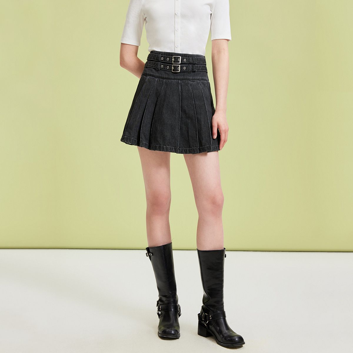半身裙学院风牛仔双腰带高腰百褶裙减龄 541521