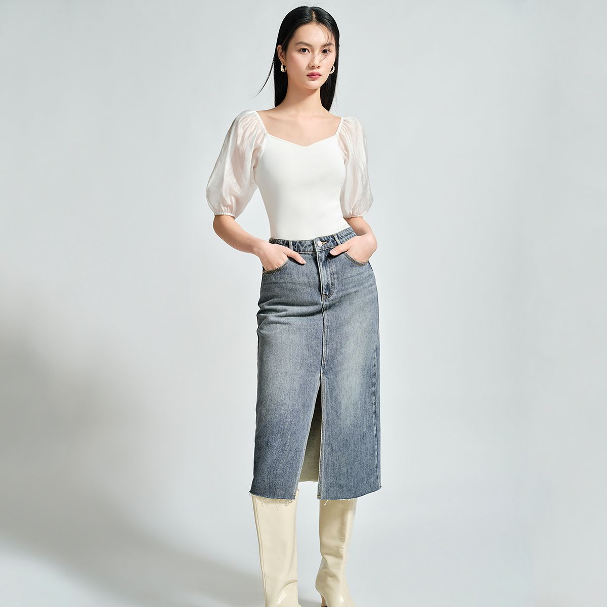 【直筒开叉】半身裙女直筒牛仔中长裙纯色高腰休闲街头简约 842449