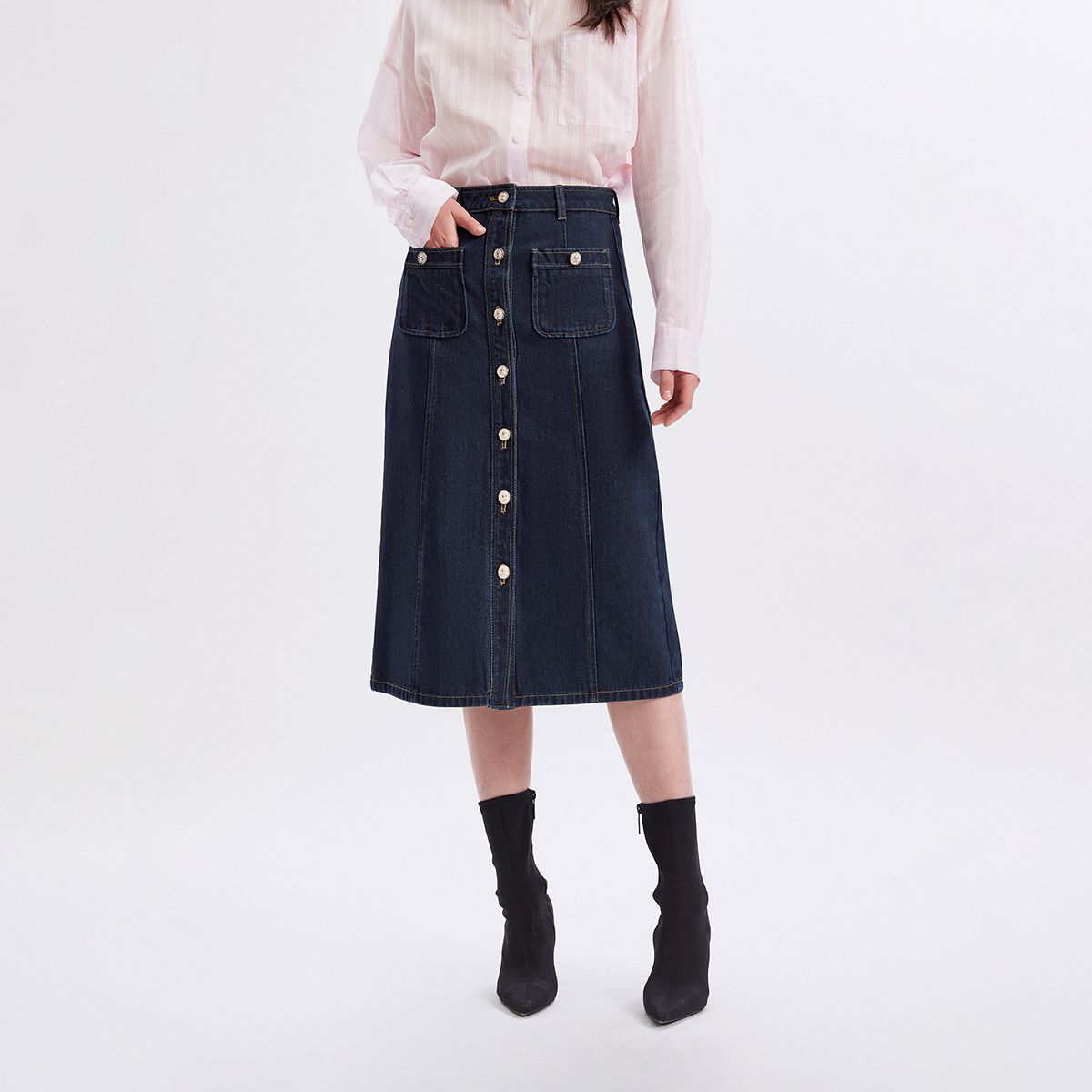 牛仔半身裙优雅街头风高腰前纽扣中长裙 412305