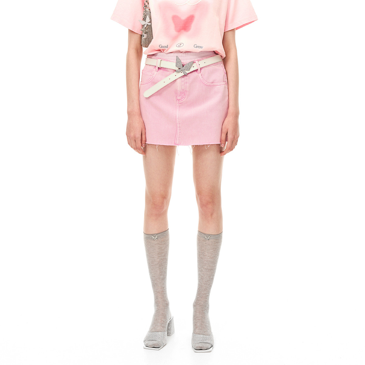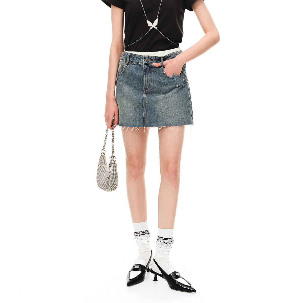地素夏秋双腰头蝴蝶贴布绣毛边牛仔短裙 146571