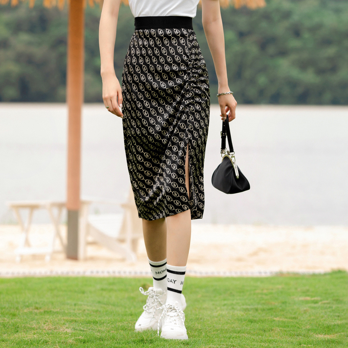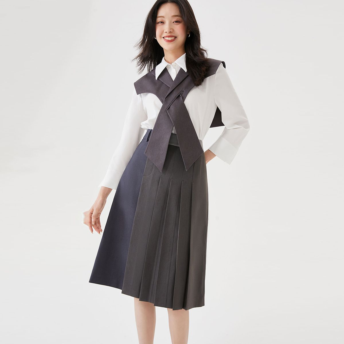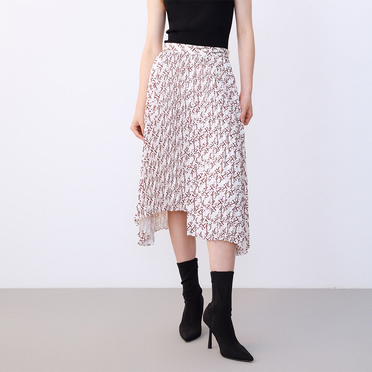 优雅高腰不对称百褶中长裙女气质百搭时尚春夏 192081