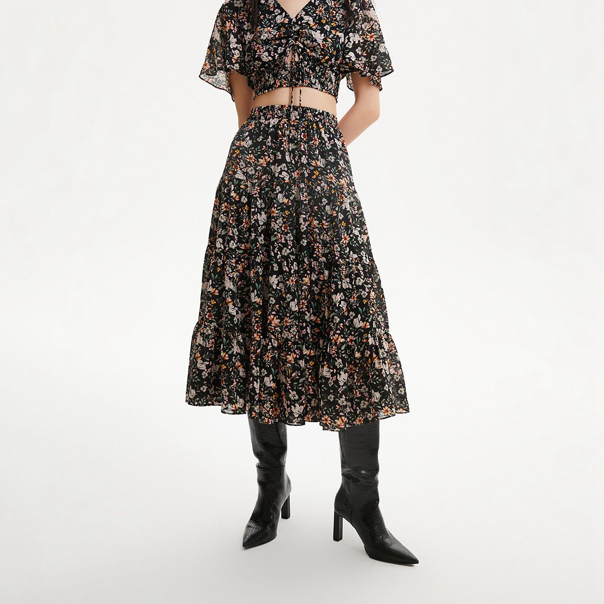 【法式优雅浪漫】春夏专柜款高腰A摆褶皱印花长裙半身裙百搭时尚 744273
