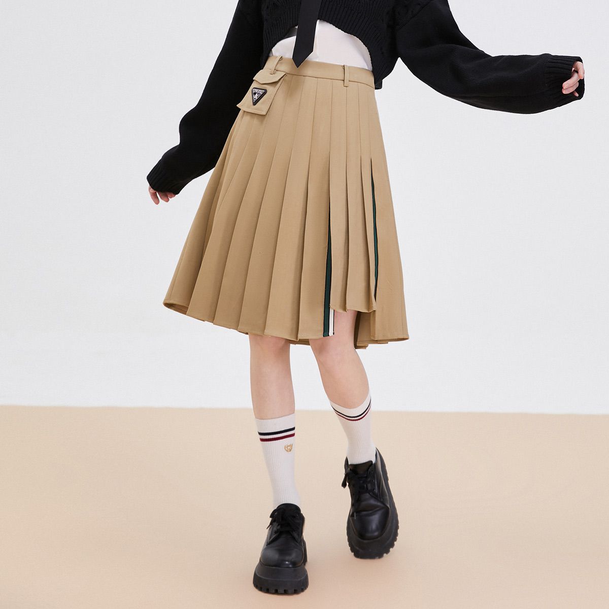 【百褶拼色春秋款】学院高腰简约通勤半身裙中长裙女 467729