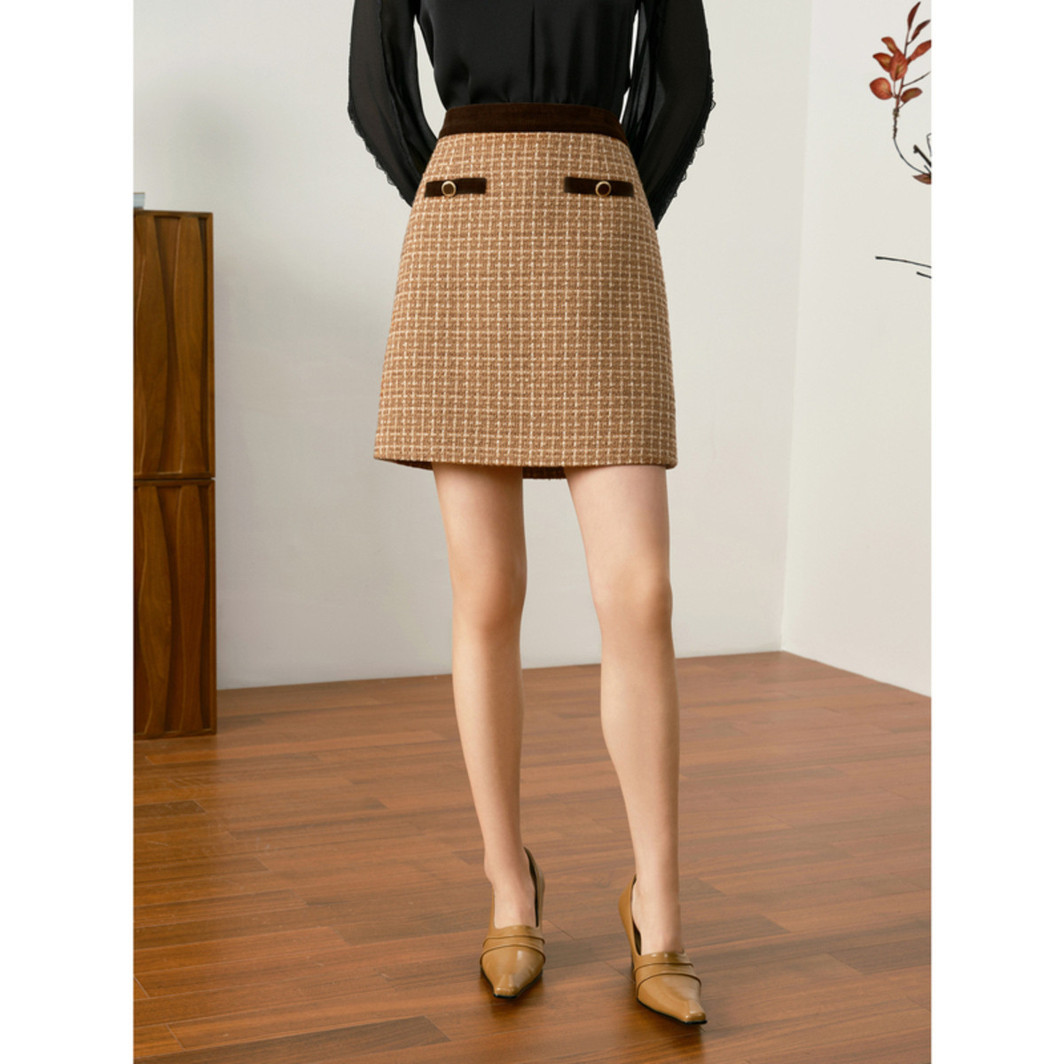 玖姿旗下安娜蔻系列商务通勤气质法式复古A字裙短裙女秋季 162764