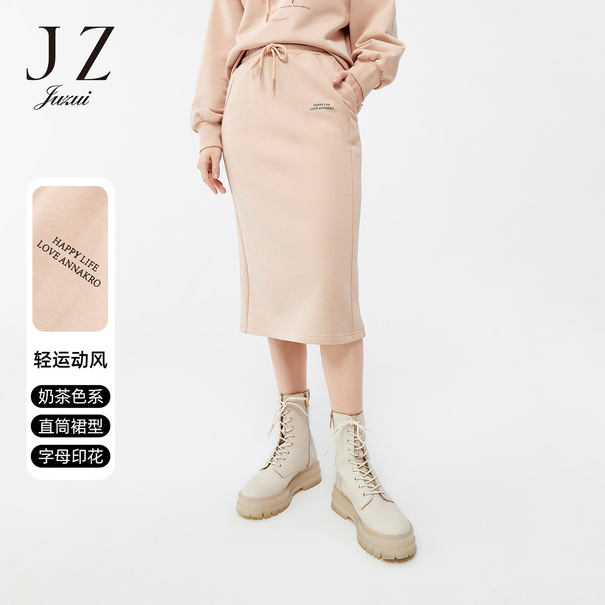 玖姿春季纯棉系带松紧腰休闲直筒中长半截裙 597196