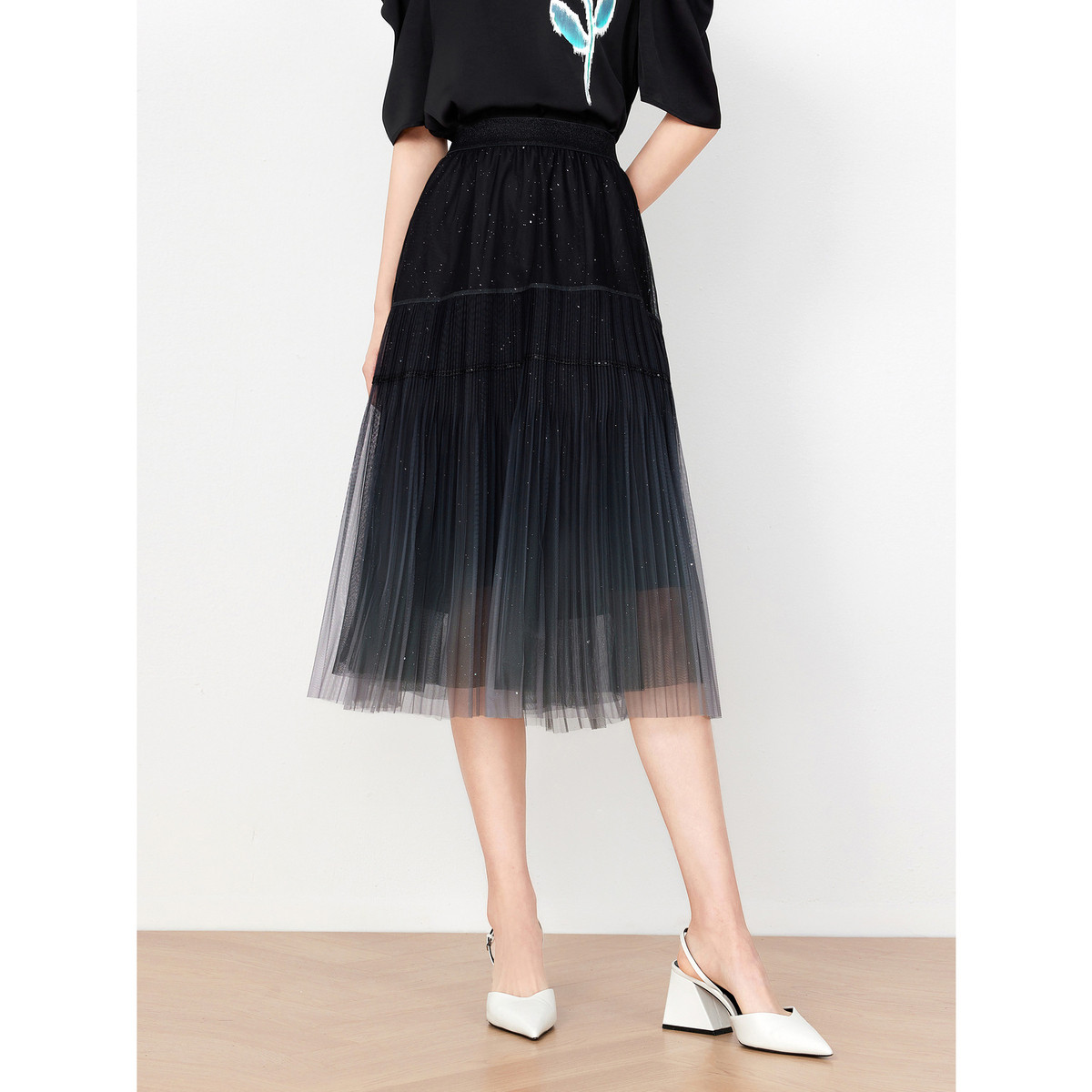 玖姿旗下安娜蔻系列渐变网纱星空半身裙女装夏季小众设计感百褶裙 011340
