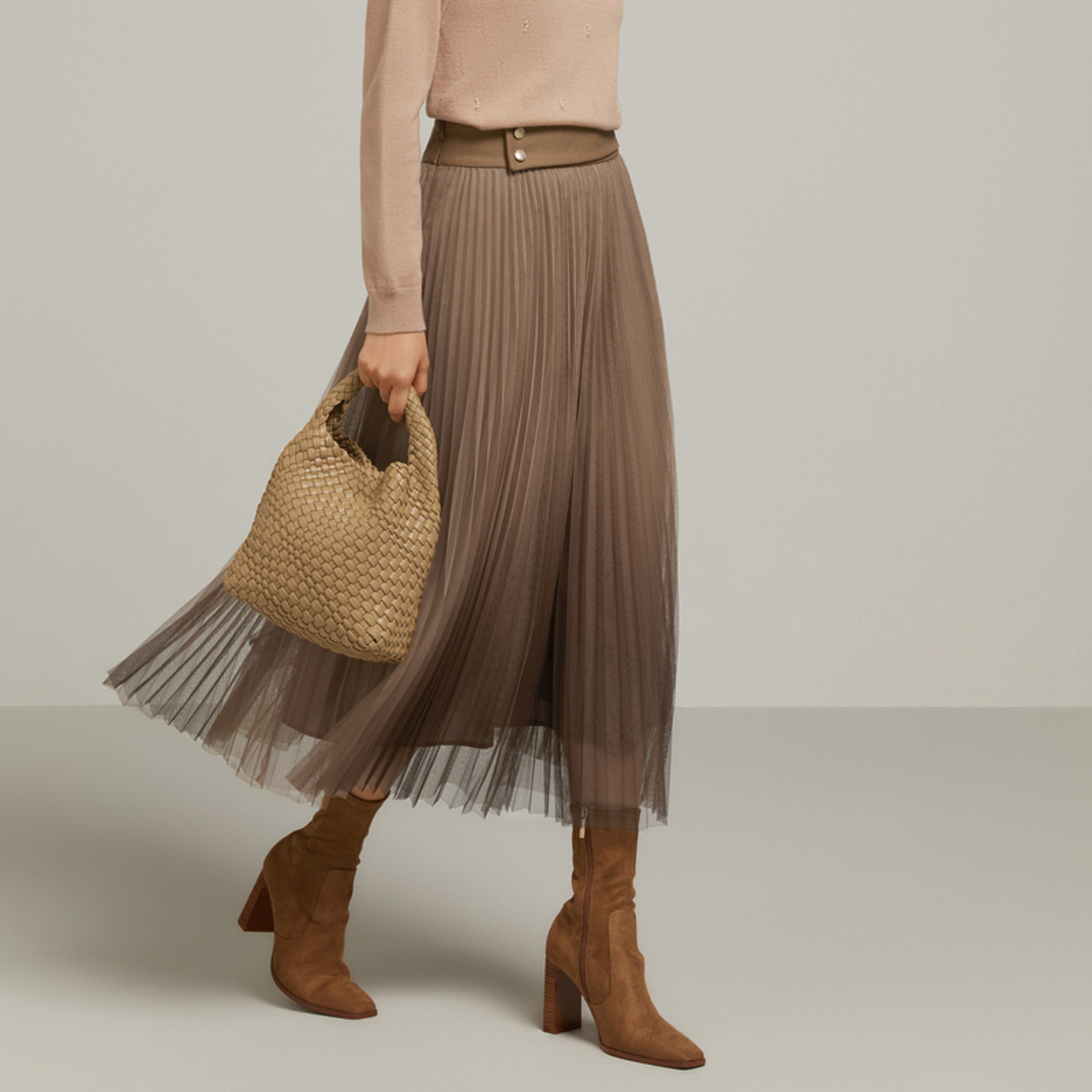 JZ玖姿百褶裙长款半身裙冬季通勤优雅压褶网纱裙 724812