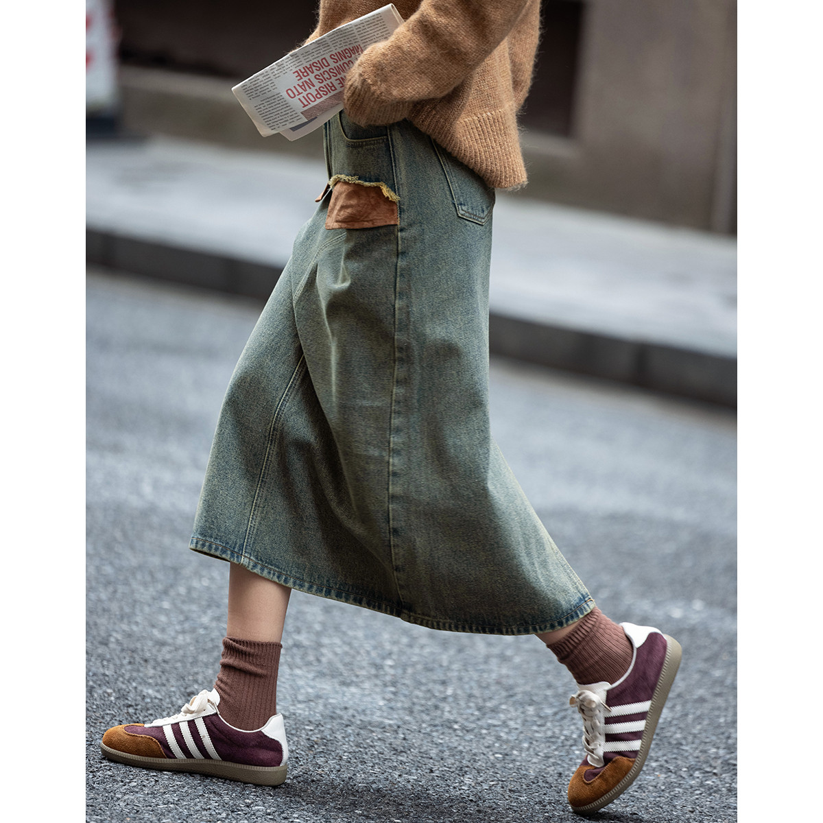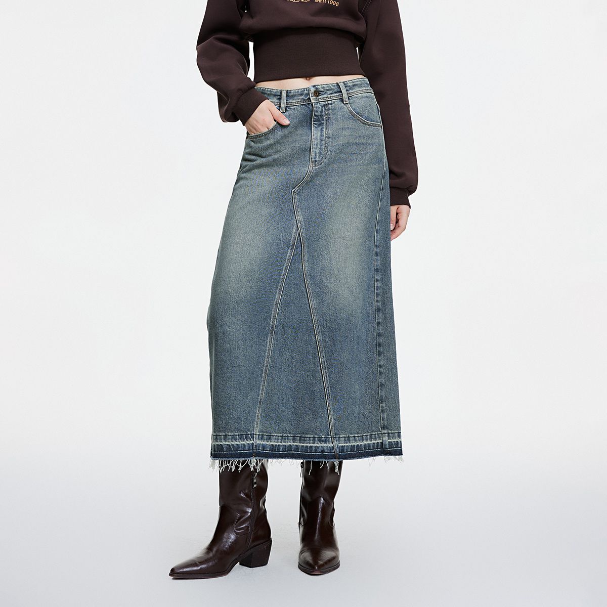 【复古蓝水洗做旧半身裙】秋面料拼接设计中长款牛仔半裙 792322