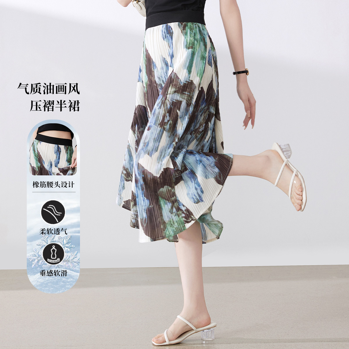 【法式花卉压褶伞裙】薄款气质优雅不规则律动a字印花肌理半裙女 047041