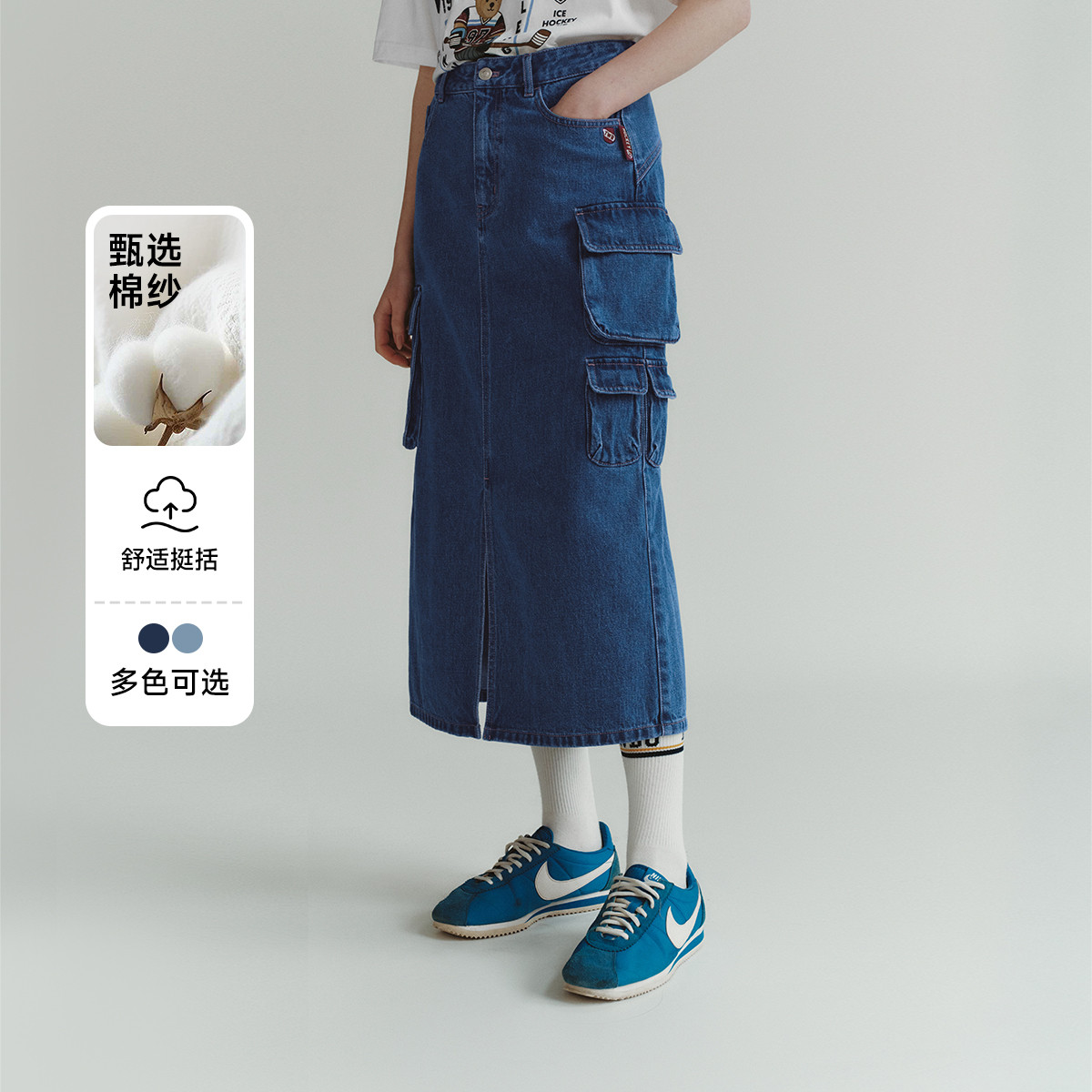 小熊休闲工装风牛仔开衩中长款半身裙女 385345