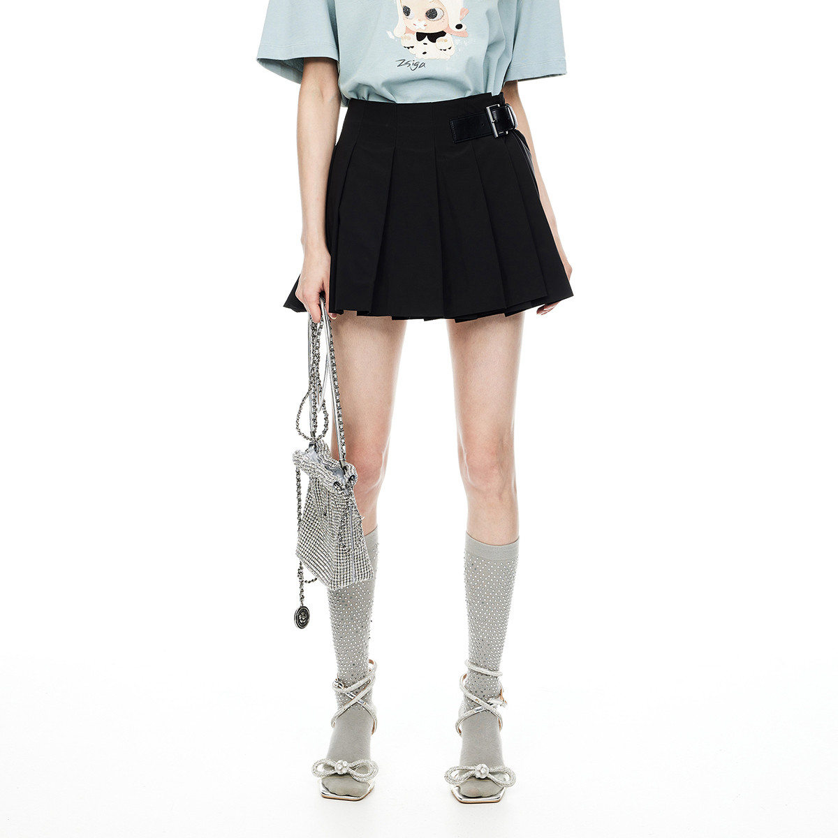 地素半身裙夏季休闲百褶裙搭扣装饰短裙女 635787