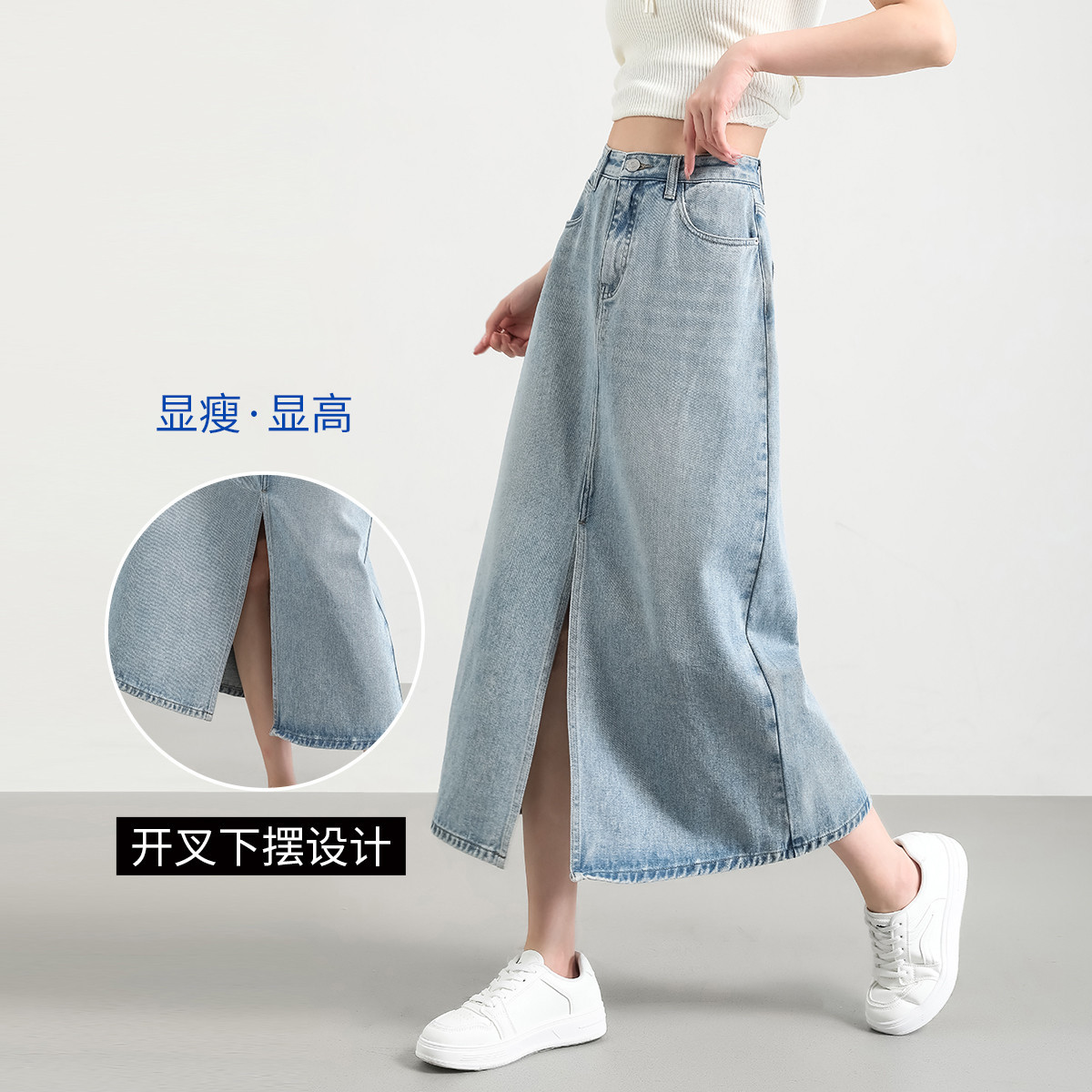 米子旗开叉A字裙女高腰牛仔半身裙宽松舒适通勤中长半截裙 367450