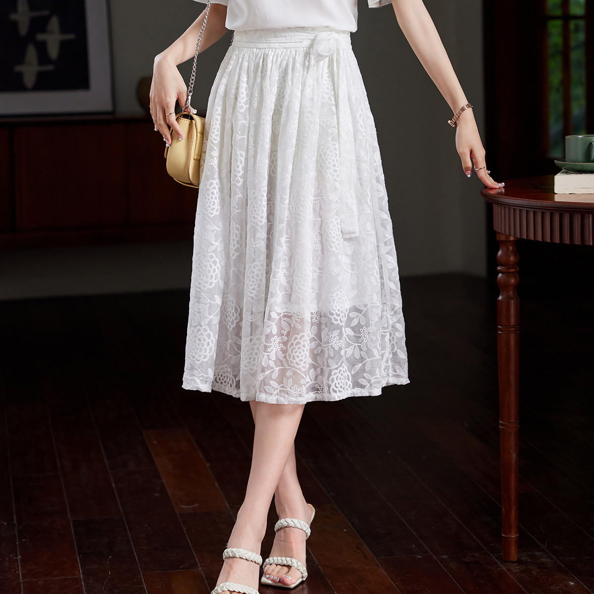 简约气质2025夏时尚纯色立体绣花修身显瘦轻奢淑女半身裙 907416