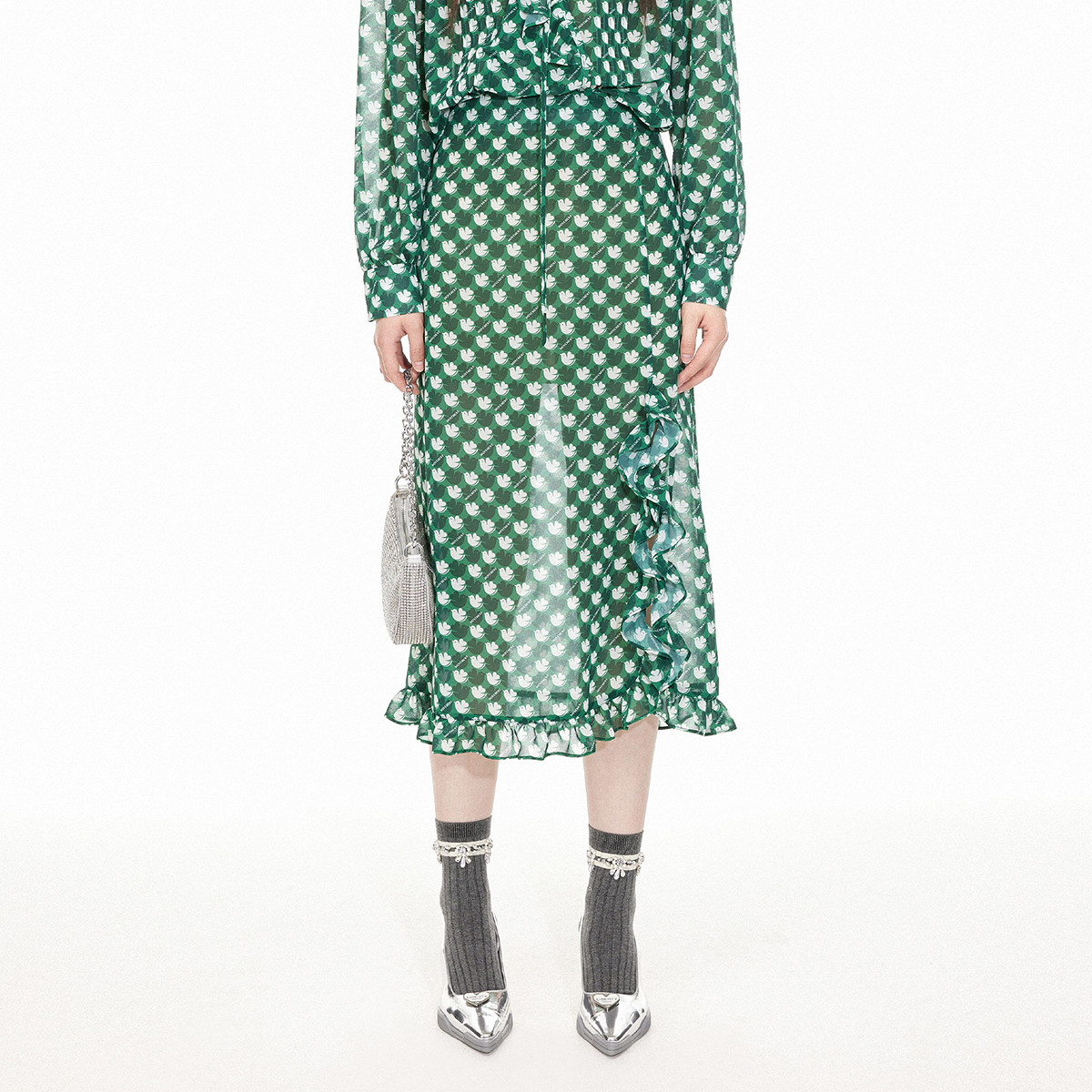 地素印花长裙春秋法式荷叶边开叉设计半身裙女 115787