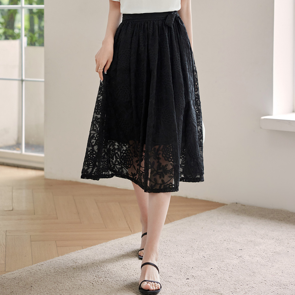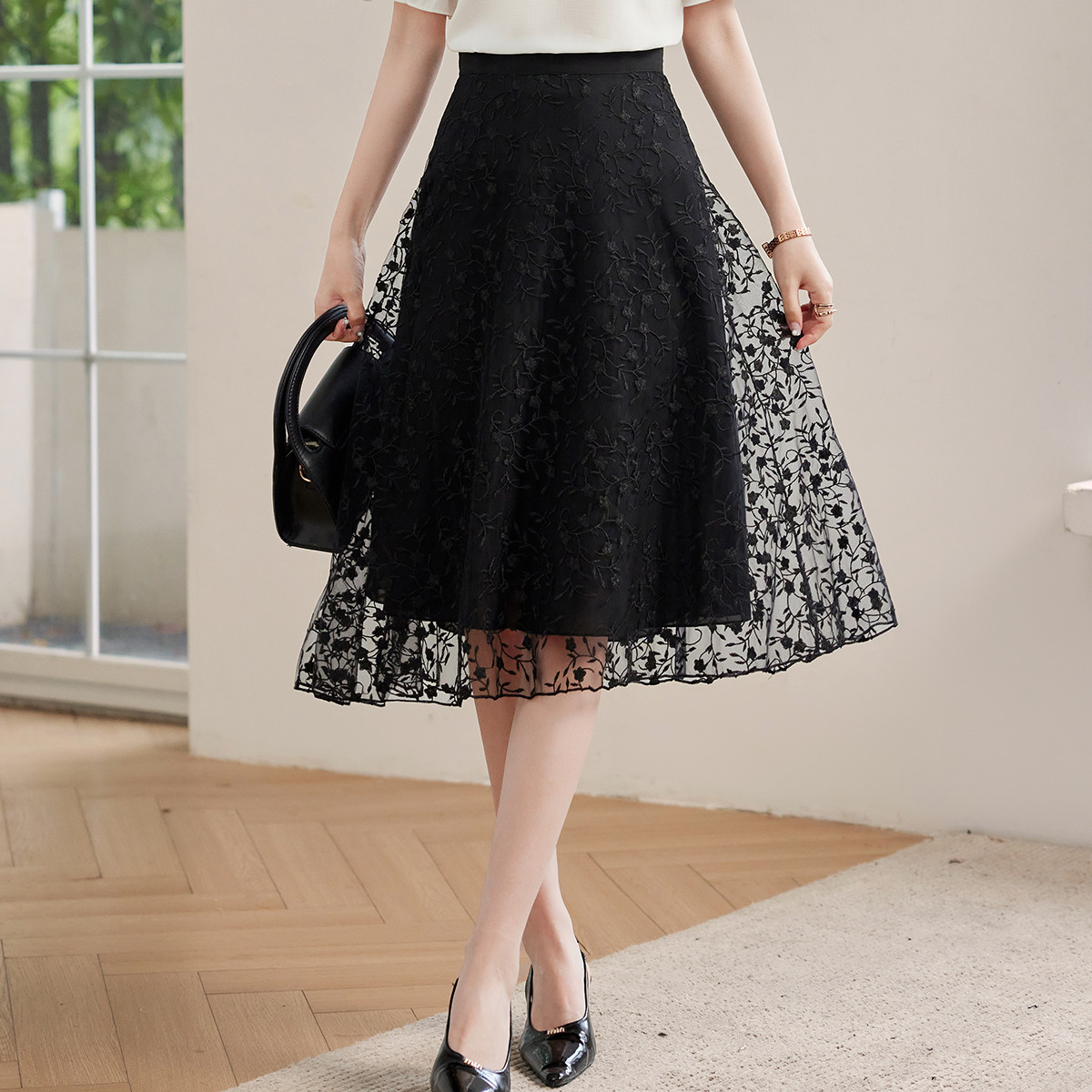 轻奢2025清新优雅气质百搭休闲纯色蕾丝绣花大摆a字中长裙女 046680