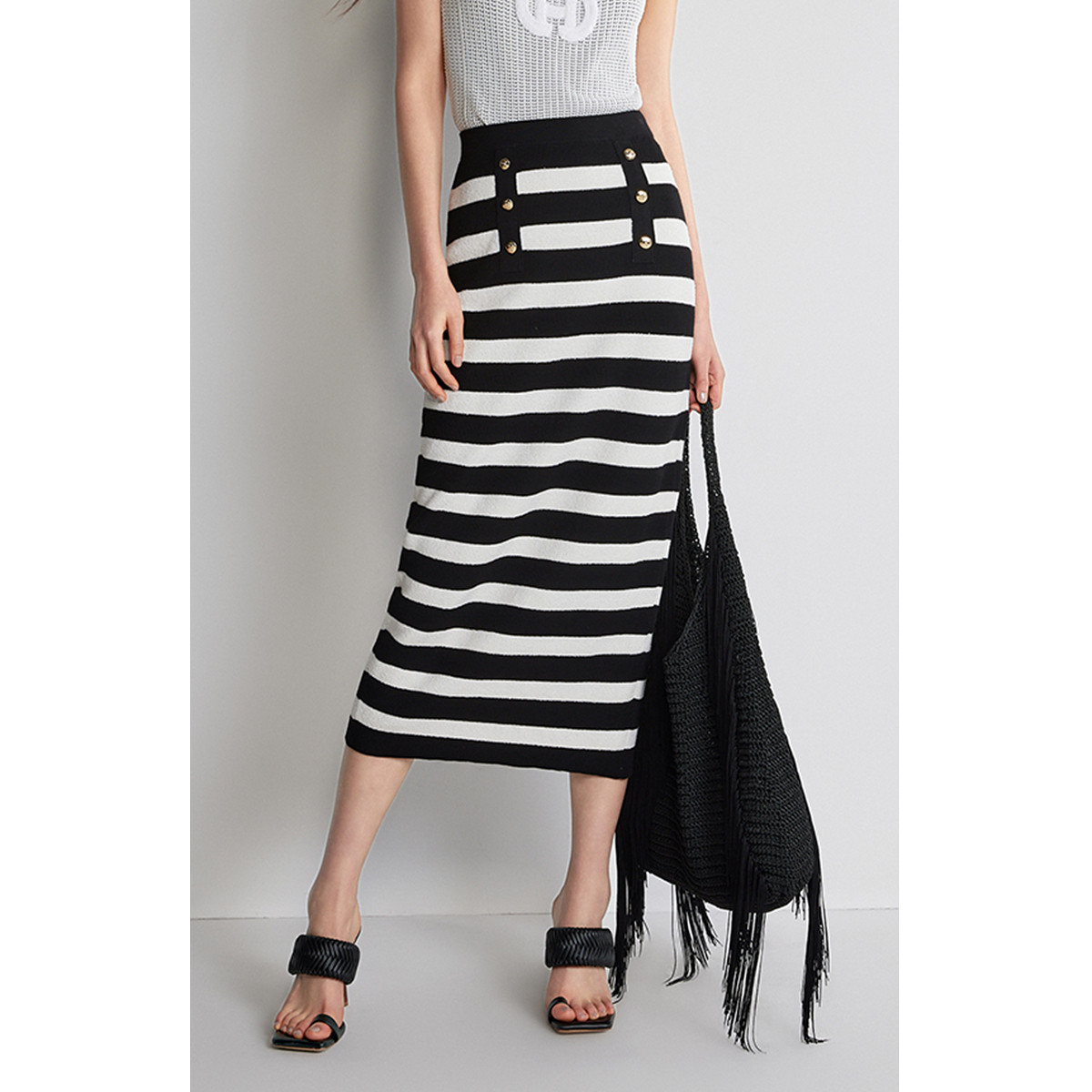 弹力条纹针织半身裙 春装高腰开衩中长款 125519