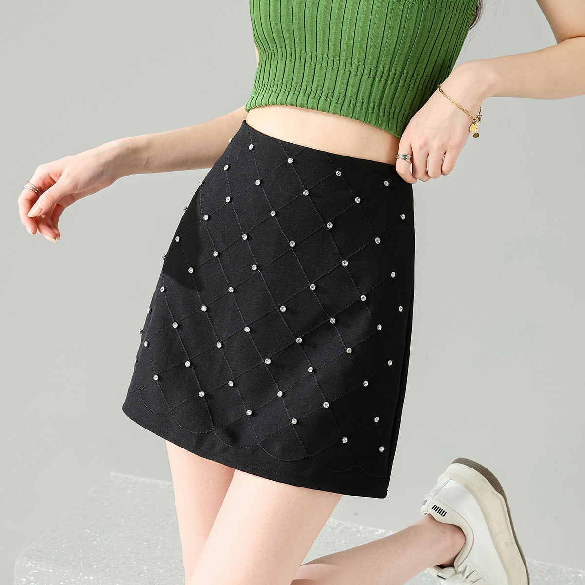 千金风高腰A字裙女夏季网格钉珠短裙女士三分半身短裙 331211