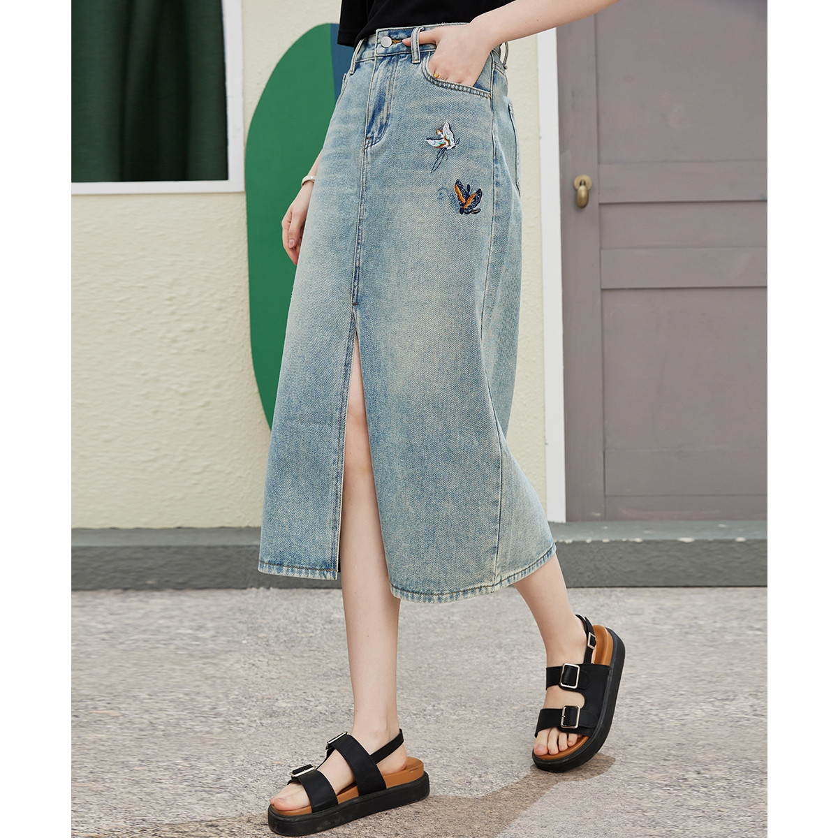 蝴蝶重工刺绣设计中长款开叉裙夏季个性高腰休闲半截裙 404829