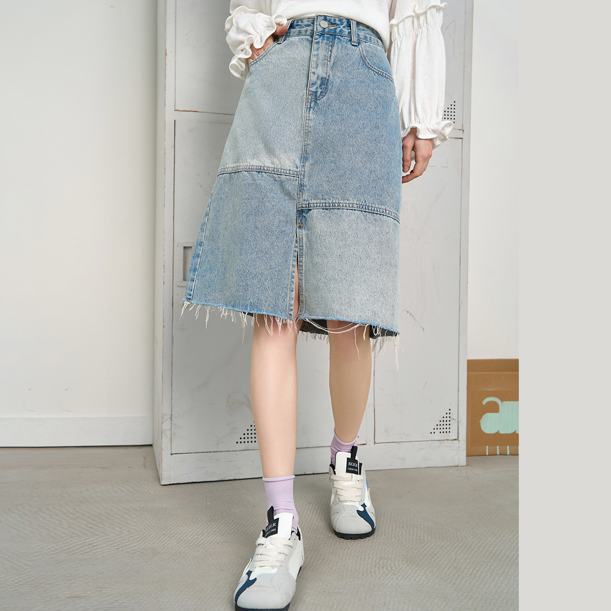 做旧风不规则鱼尾牛仔五分A字裙2025夏季拼接休闲女式半截裙 120285