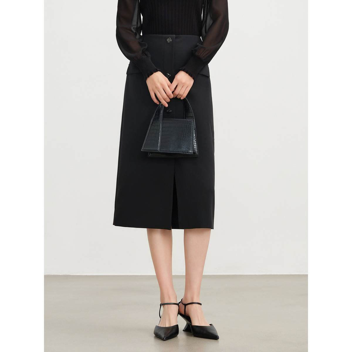 玖姿旗下安娜蔻系列经典剪裁简约开叉直筒半身裙腰裙女春季 446668