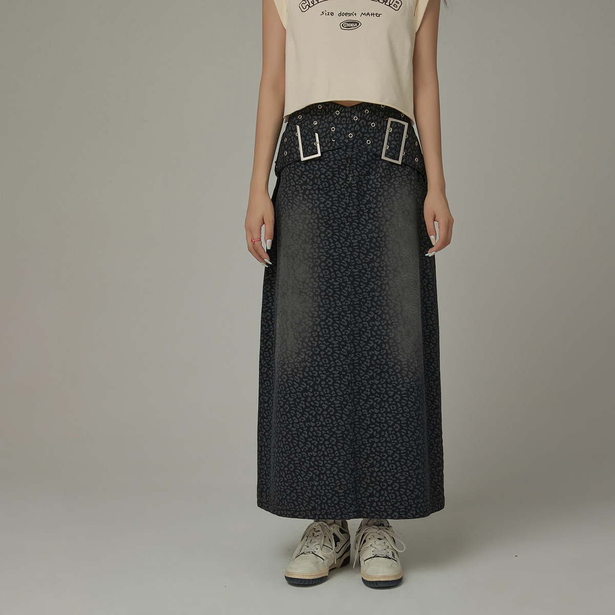 豹纹半身裙女春秋字母贴布绣腰带牛仔开叉中长裙子 162259