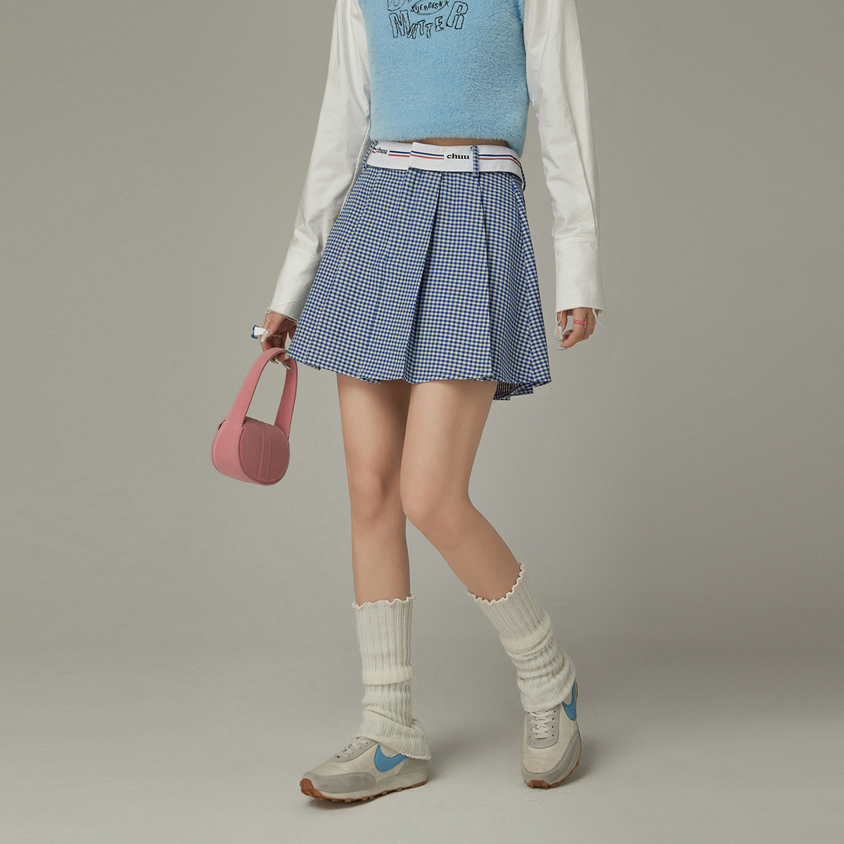 CHUU高腰格子百褶半身裙女春秋撞色印花a字裙子 670739