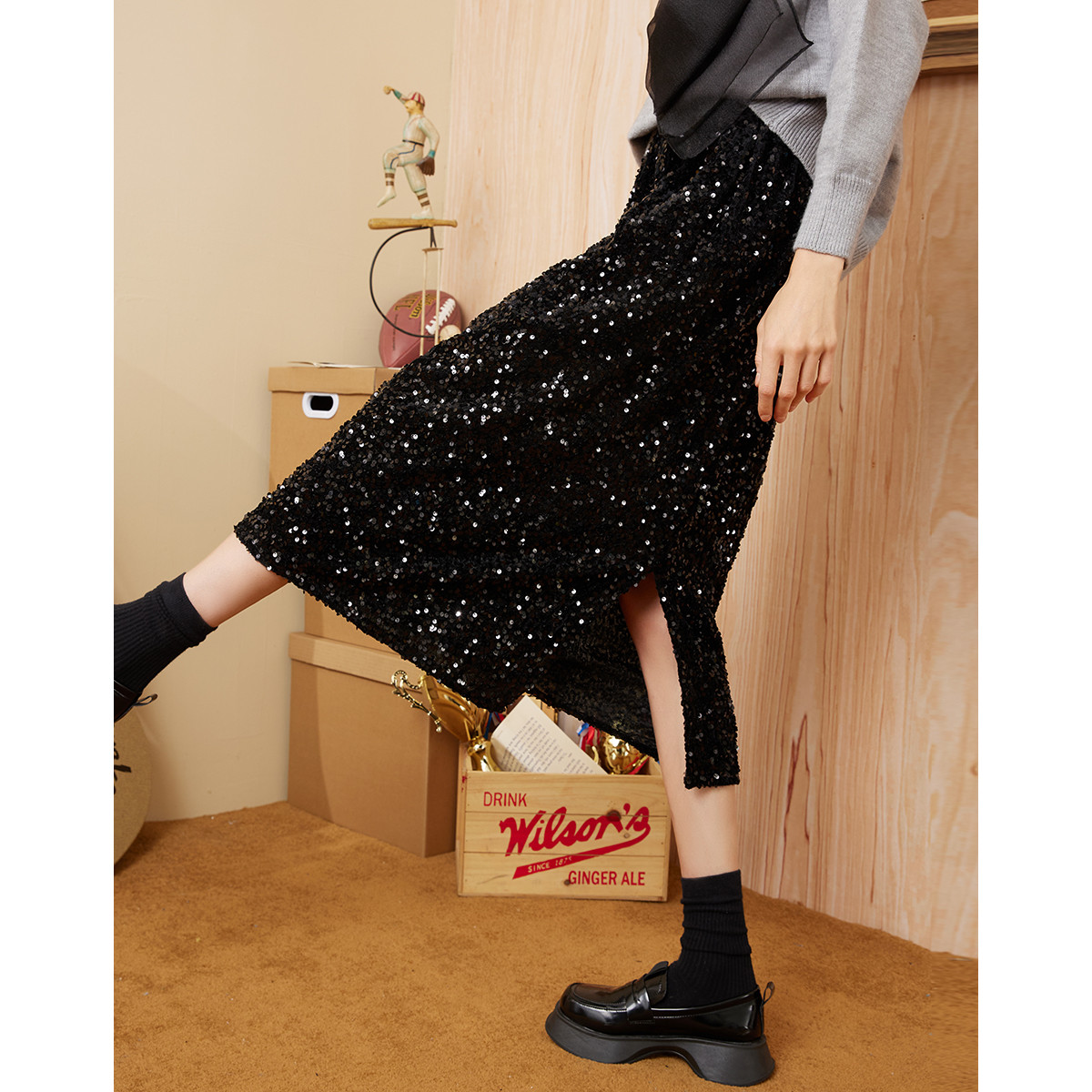 复古闪闪亮片时尚a字裙宽松开叉设计感百搭直筒气质半截裙女 685917