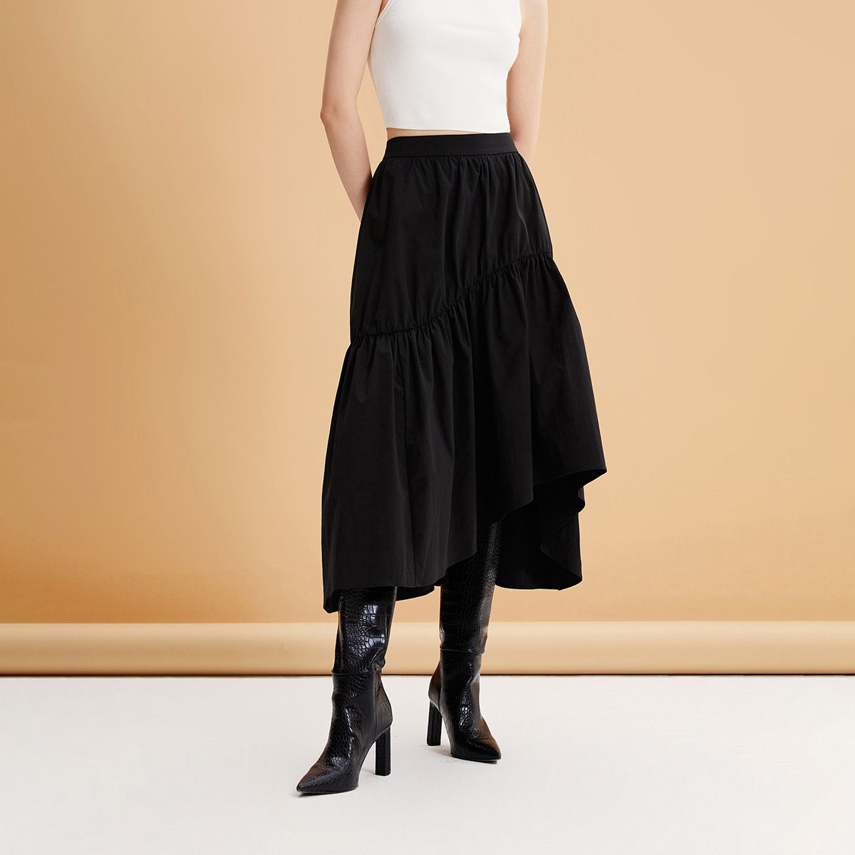 【春夏专柜款】黑色拼接松紧腰褶皱伞裙半身裙气质百搭时尚 967889