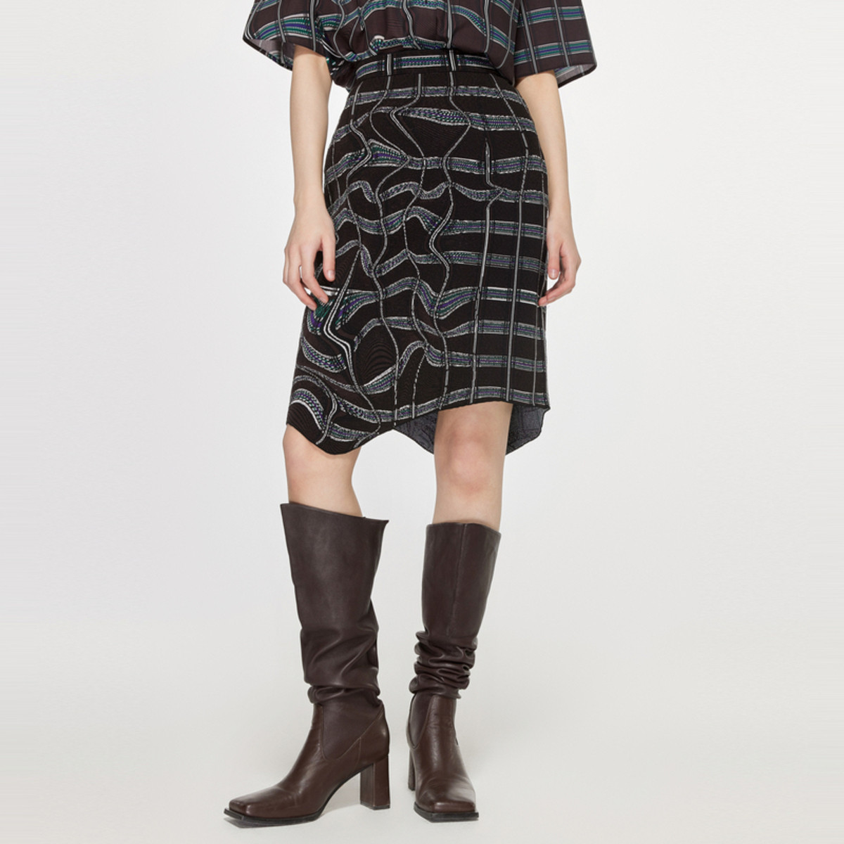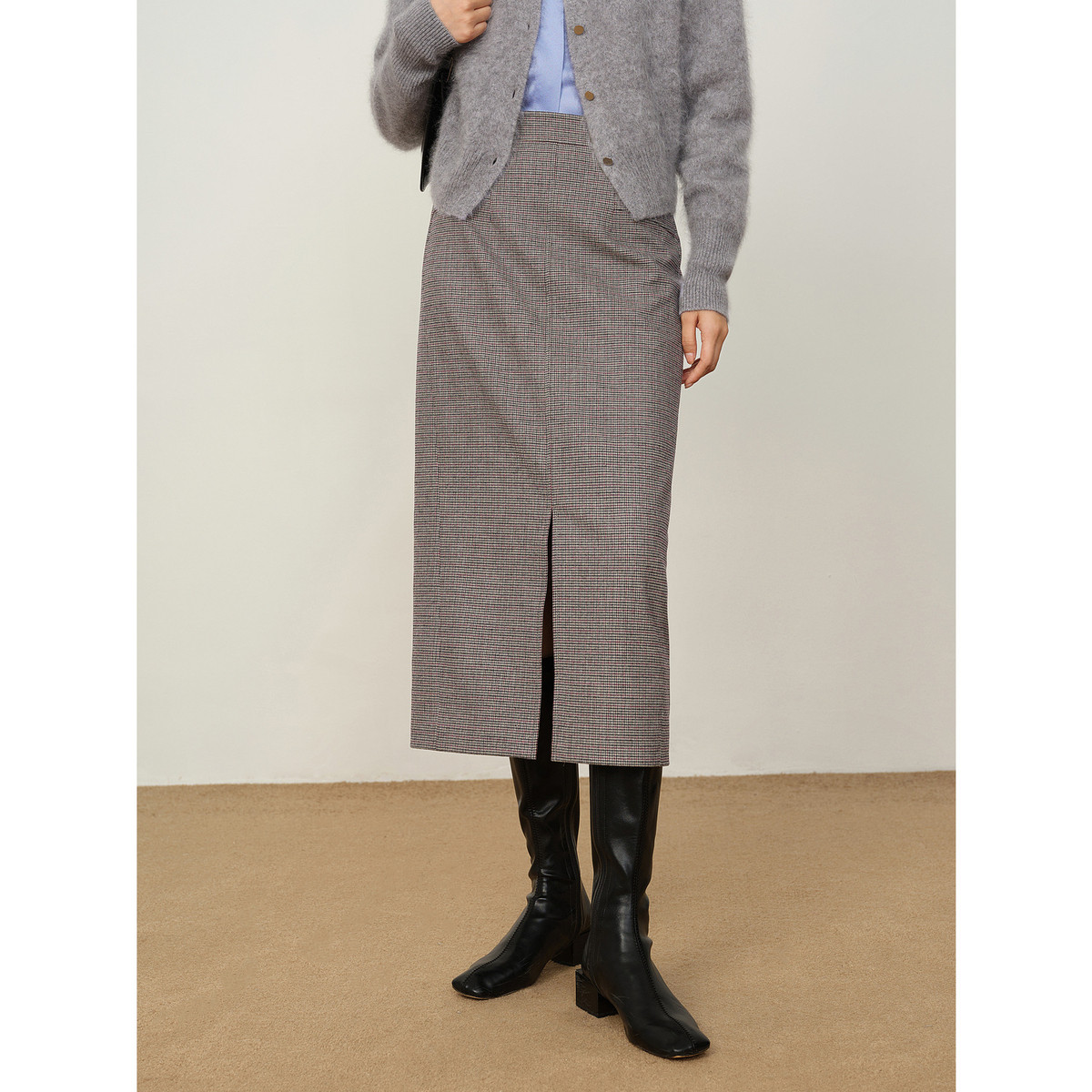 玖姿旗下安娜蔻系列格纹前中开叉半身裙长裙包臀裙女冬季 421772