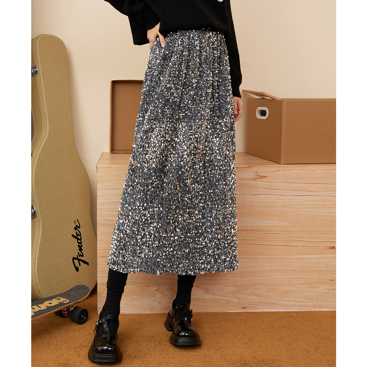 复古闪闪亮片时尚a字裙宽松开叉设计感百搭直筒气质半截裙女 347677