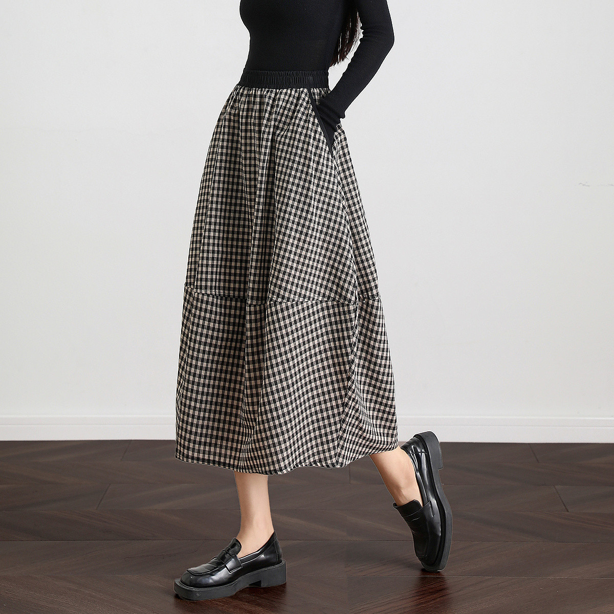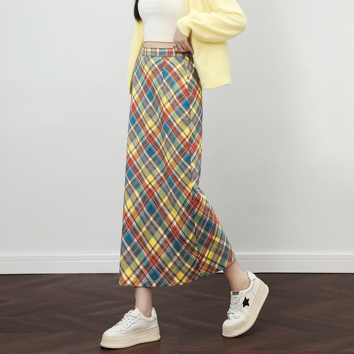 【港风复古穿搭】秋轻龄感多巴胺撞色格纹松紧腰藏肉中长半身裙女 170817