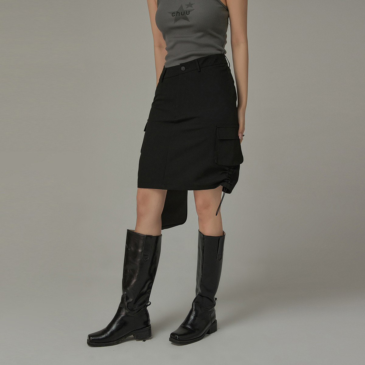 CHUU抽绳褶皱斜腰半身裙女士秋a字短裙子 641107