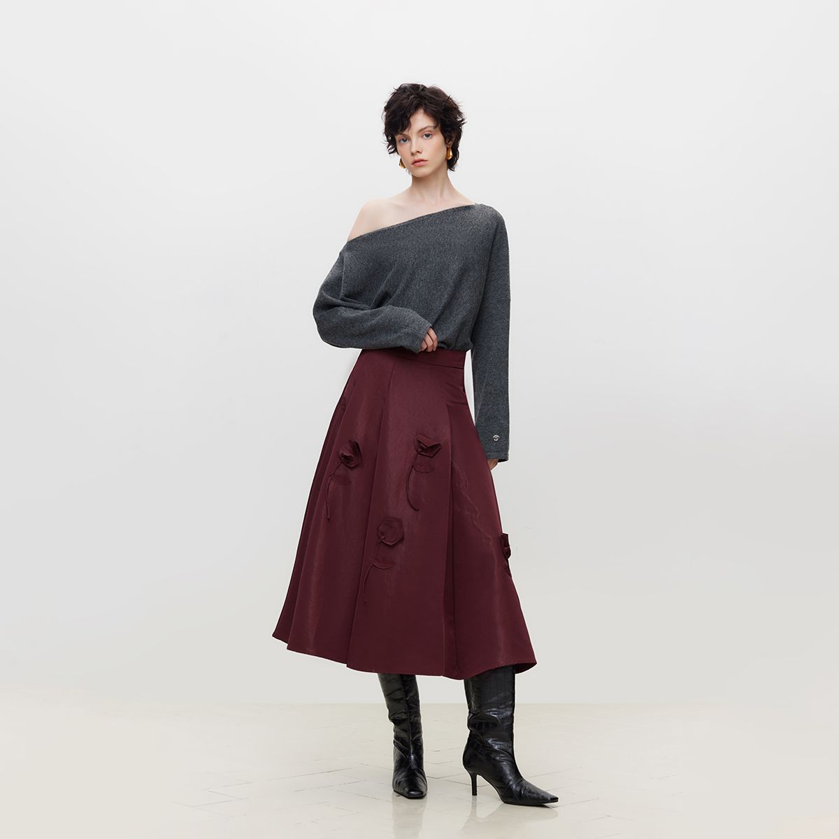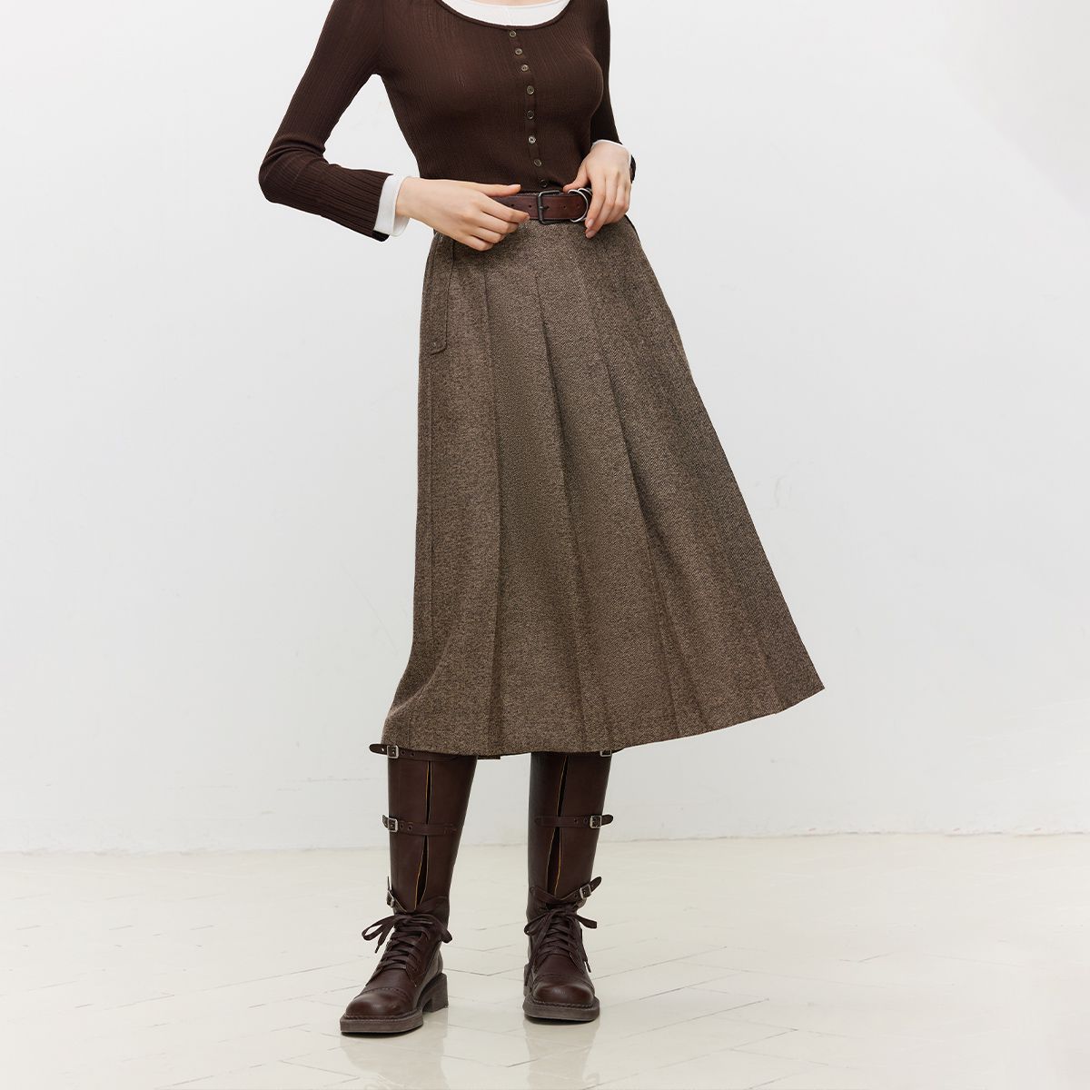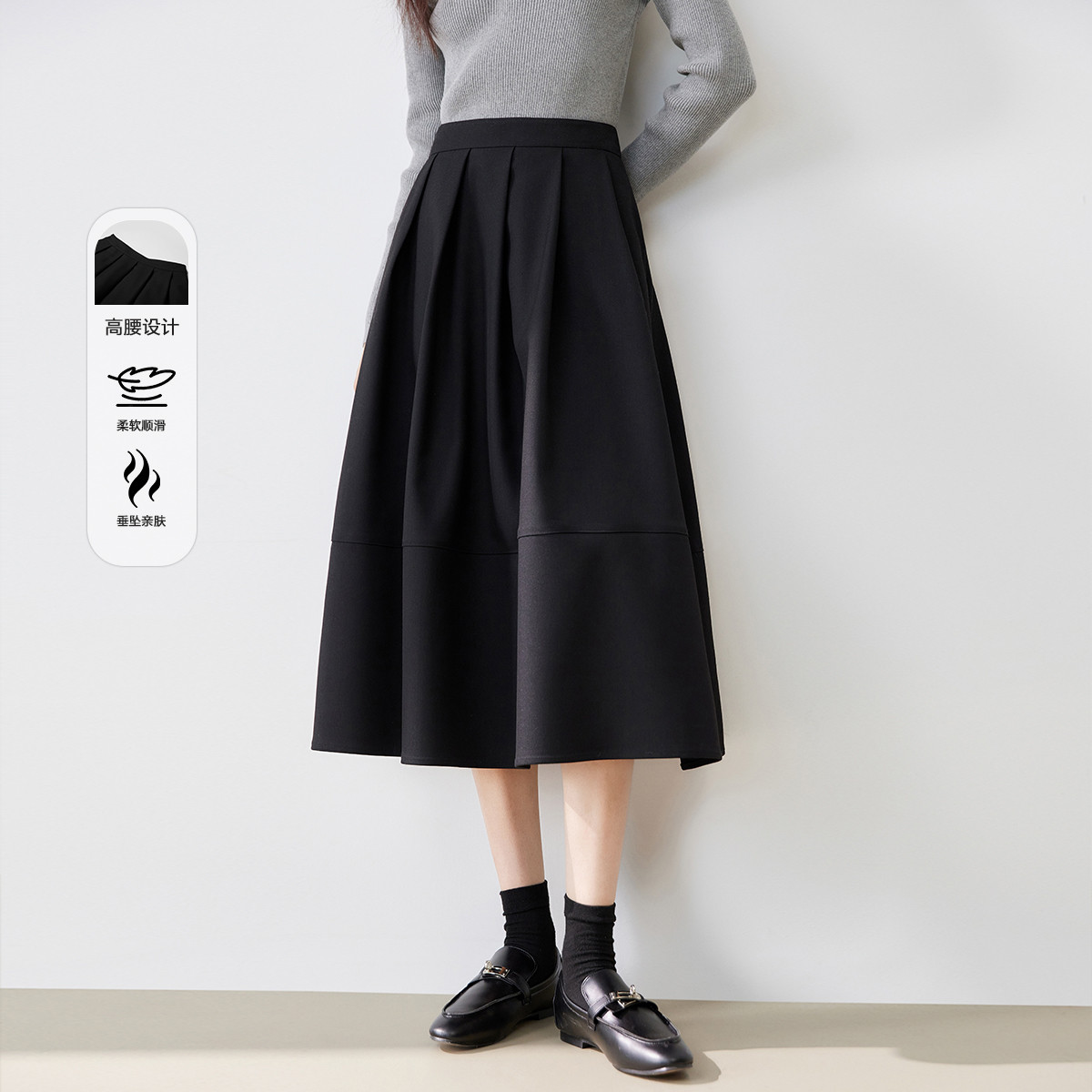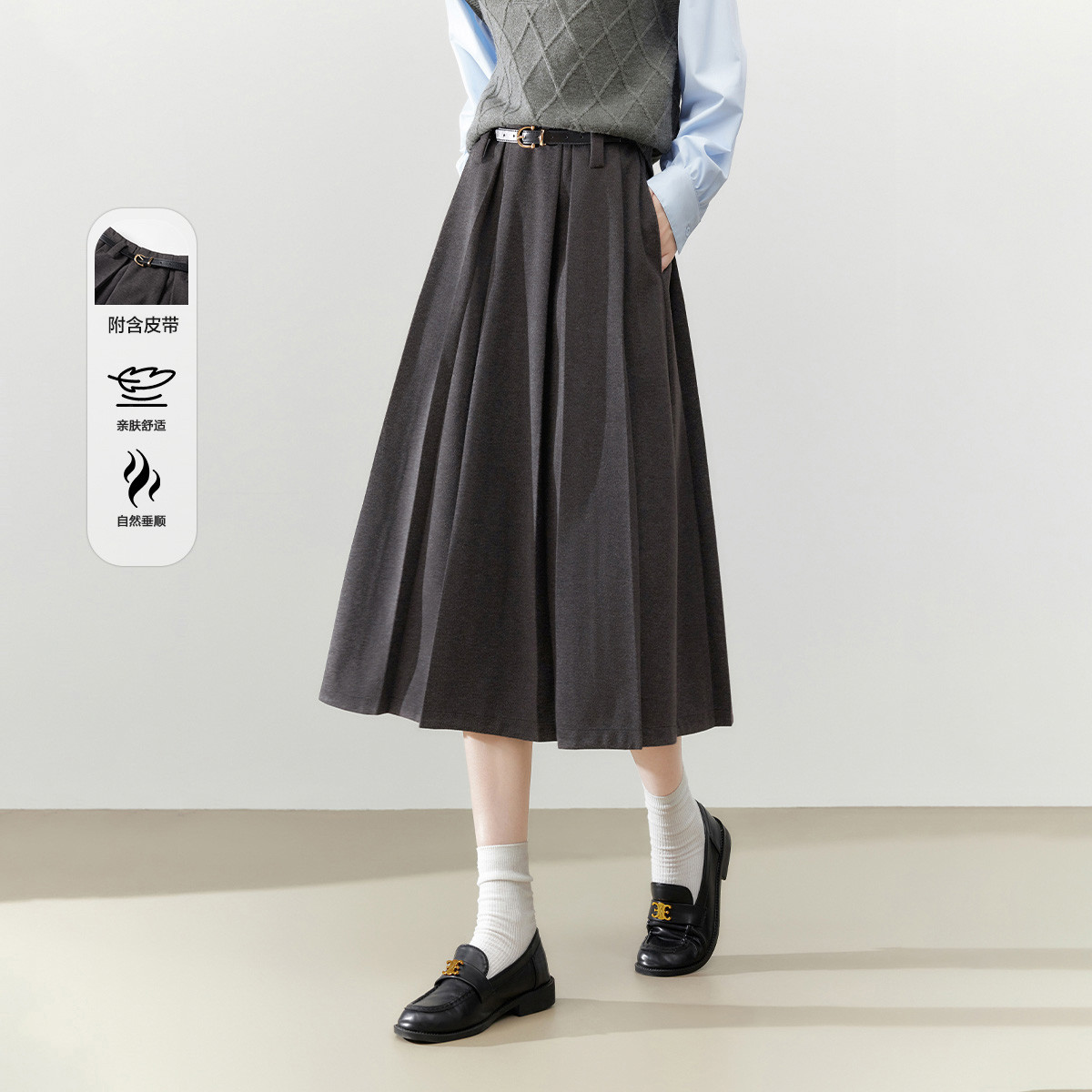 【2024秋冬季】含腰带格雷系经典复古百褶半身裙女百搭高腰裙 200020