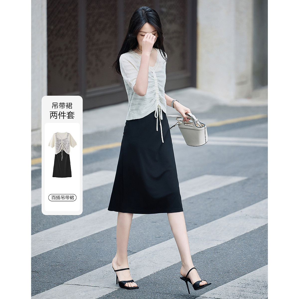 【盘活衣橱】夏新罗马棉两件套V领修身吊带裙针织外套女套装时尚 340161