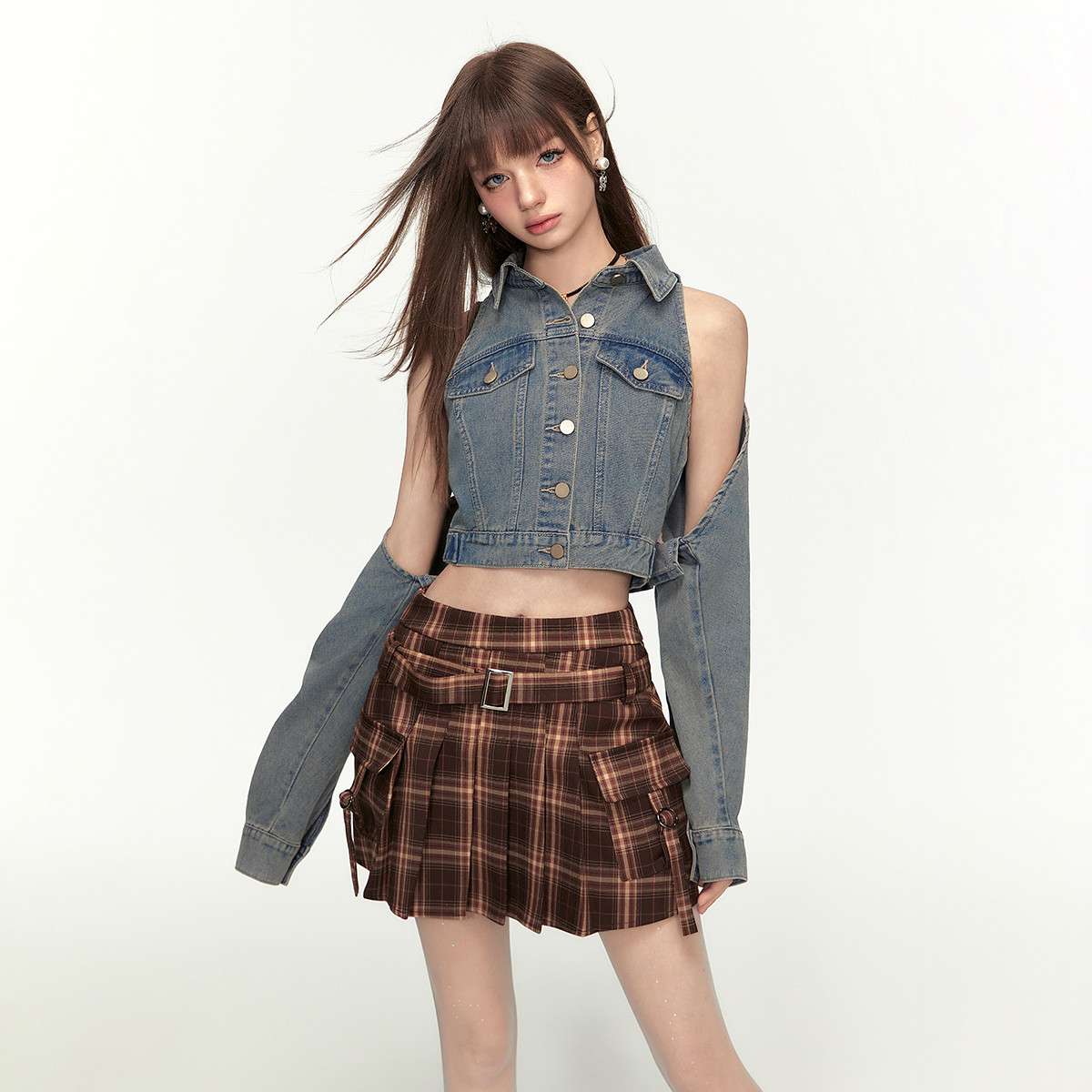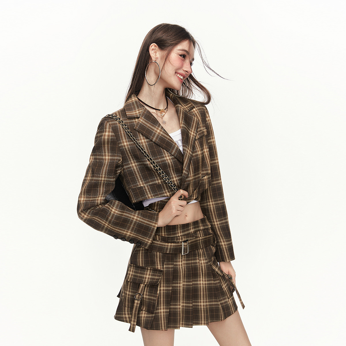 【2024春装】美式辣妹格纹露脐交叉带短西装短裙套装 422740
