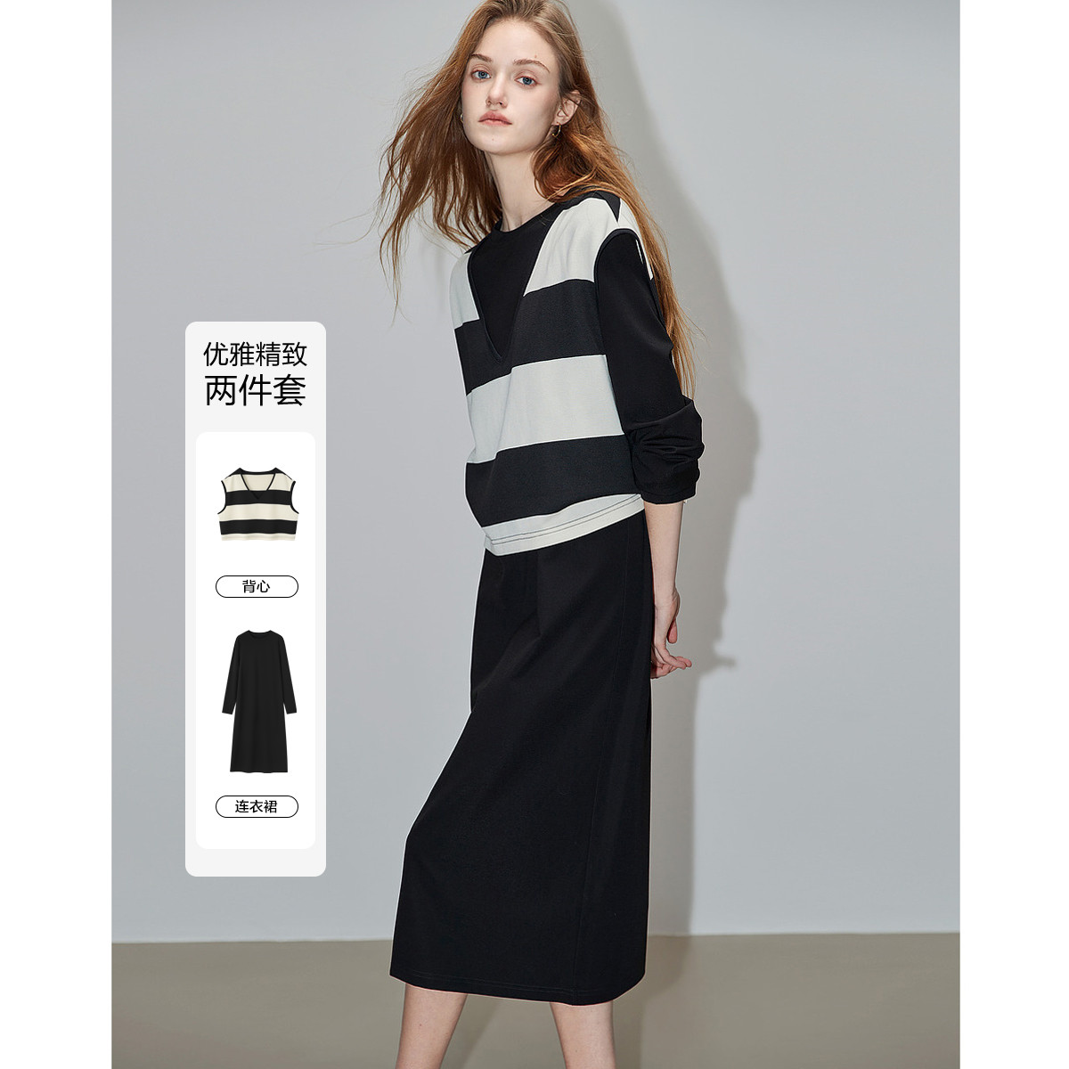 【懒人休闲套装】春秋新时尚垂感罗马布连衣裙箱型条纹马甲两件套 723841