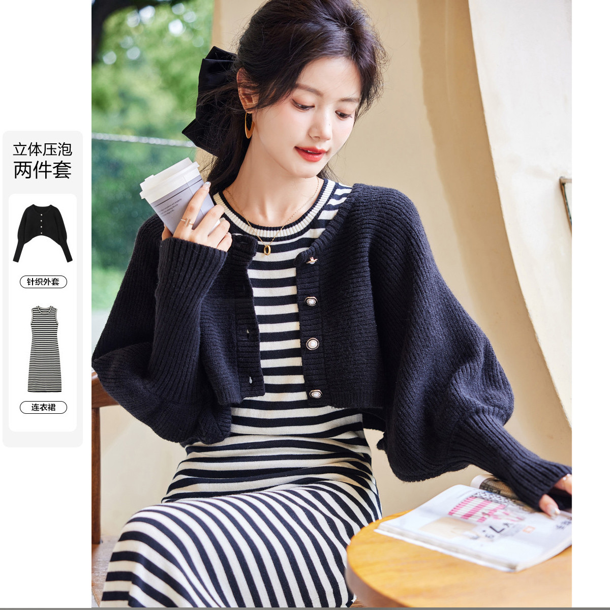 【复古名媛针织条纹套装】春秋简约圆领OL宽松两件套 020033