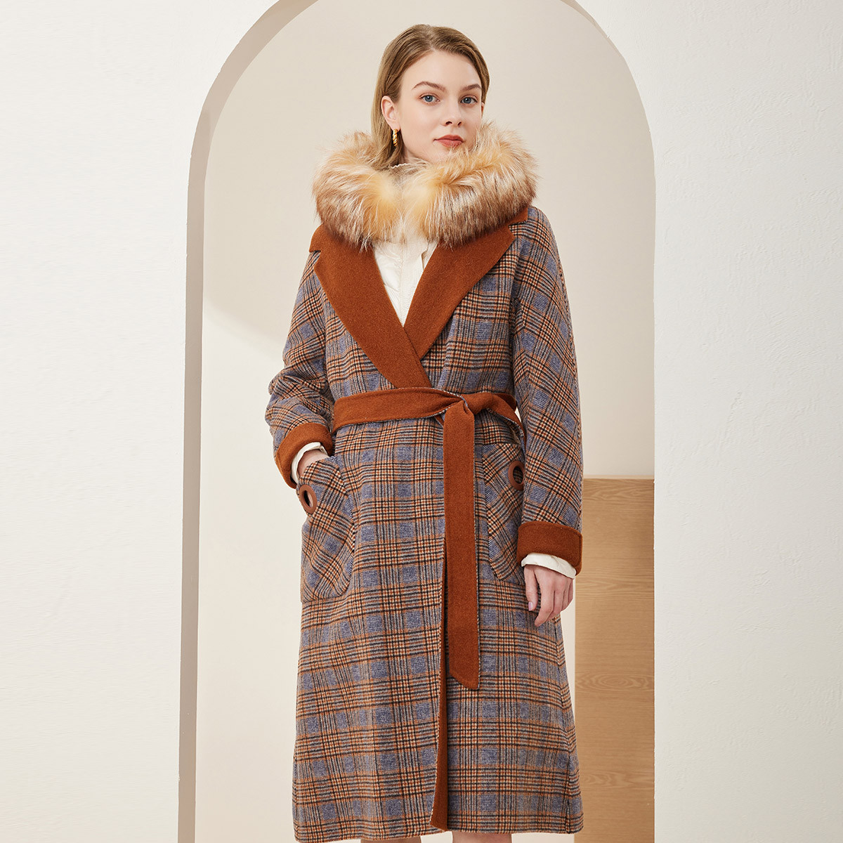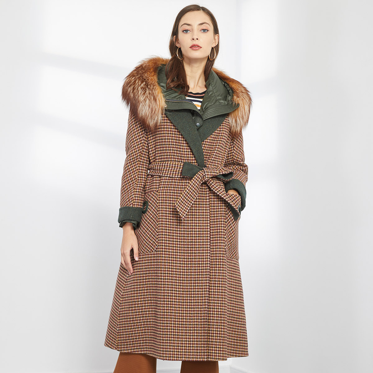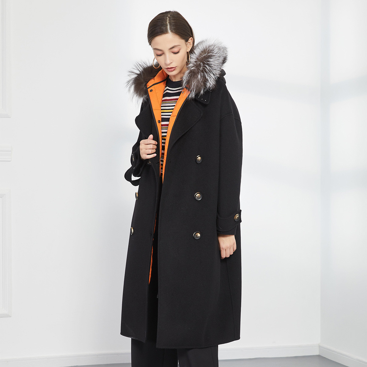 廓形宽松轻薄保暖可脱卸毛领两件套女式大衣外套冬季 109855