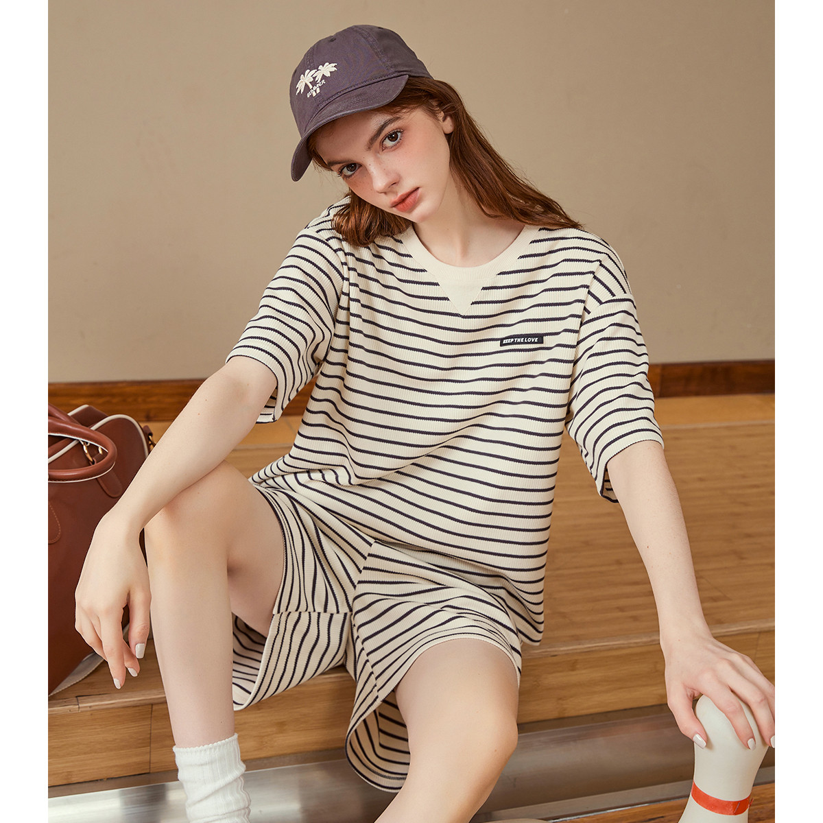 夏季圆领条纹短袖T恤宽松短裤慵懒风百搭女式套装 465821
