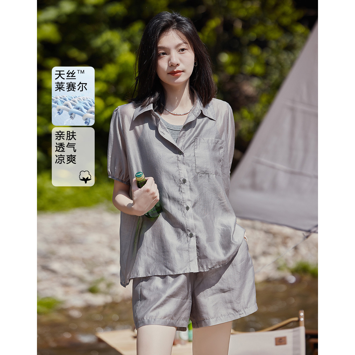 【泡泡袖天丝套装】夏款休闲风小翻领上衣短裤两件套 664642