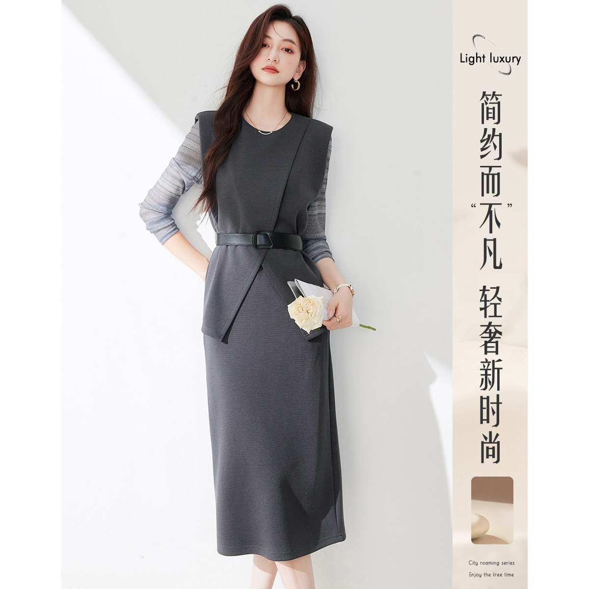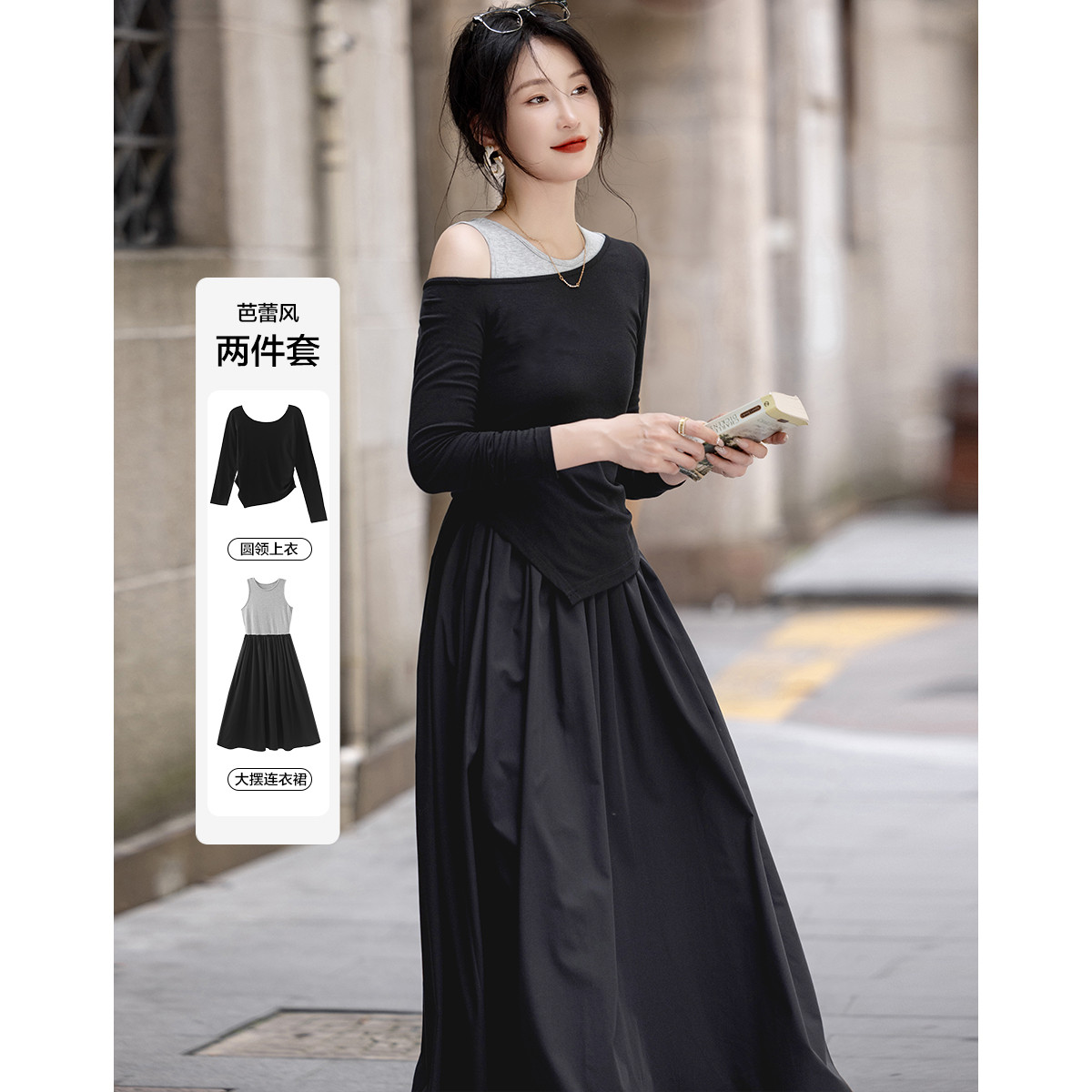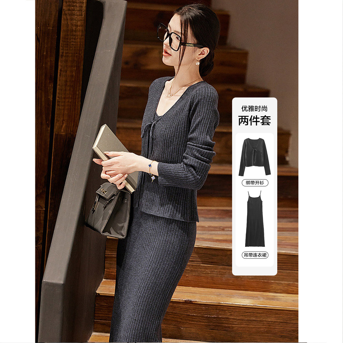 【芭蕾风针织套装】春秋优雅风V领背心连衣裙慵懒大领子上衣两件 670145
