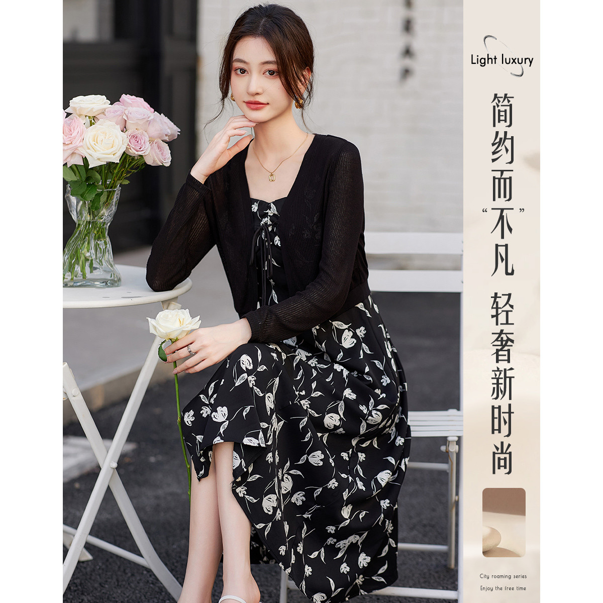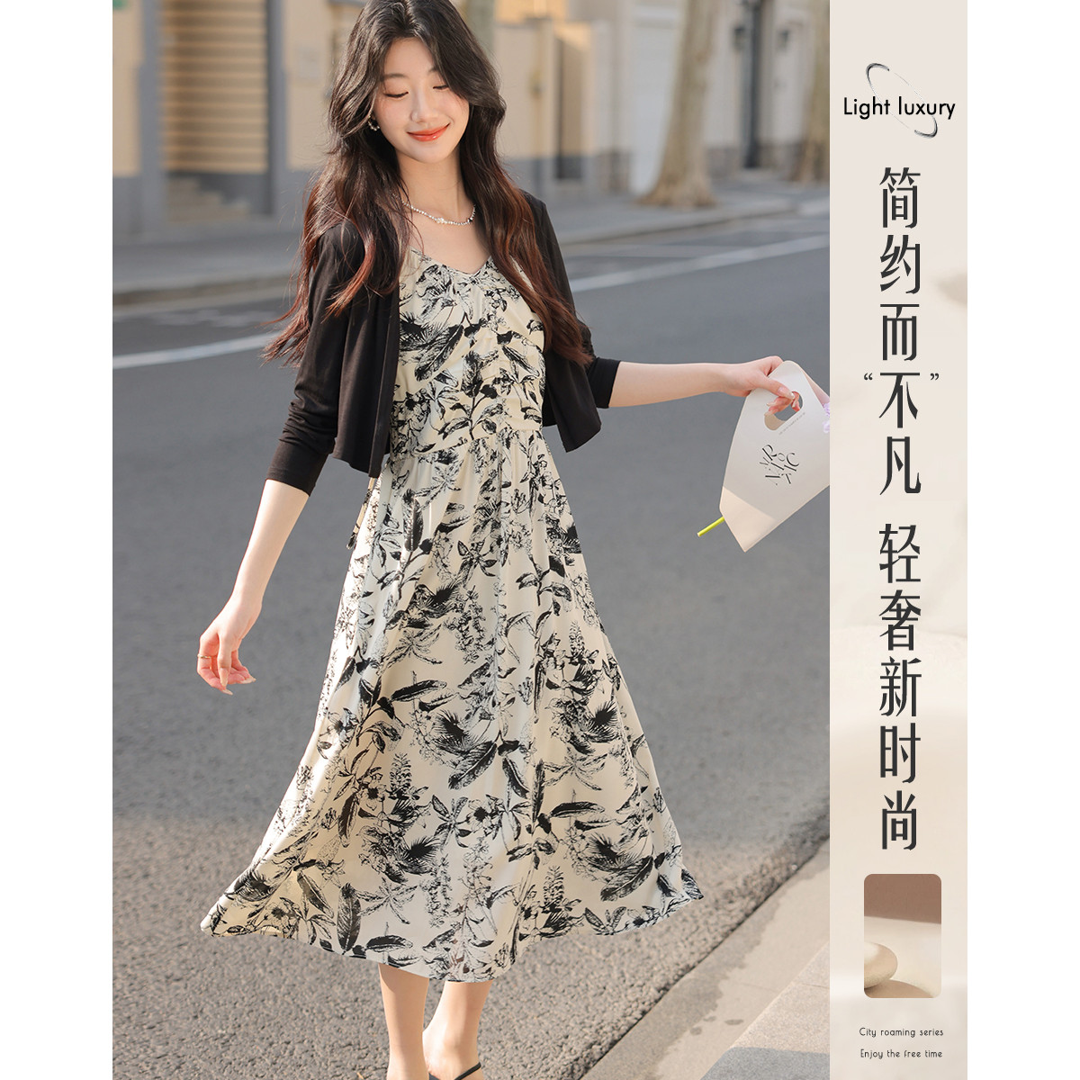 春减龄印花吊带裙开衫两件套时尚简约遮肉套装 053016