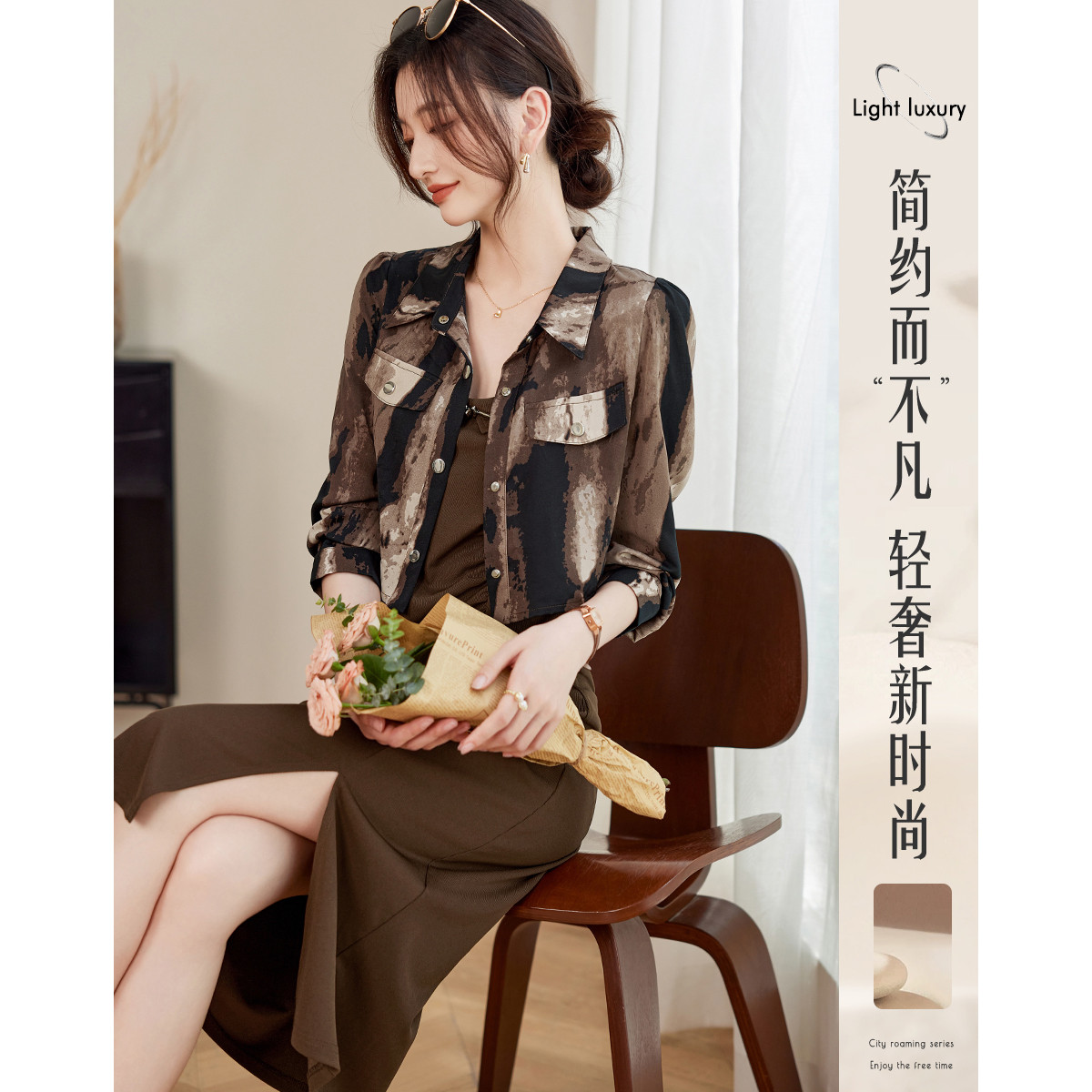 轻熟风扎染印花衬衫开叉褶皱吊带裙两件套连衣裙 433496