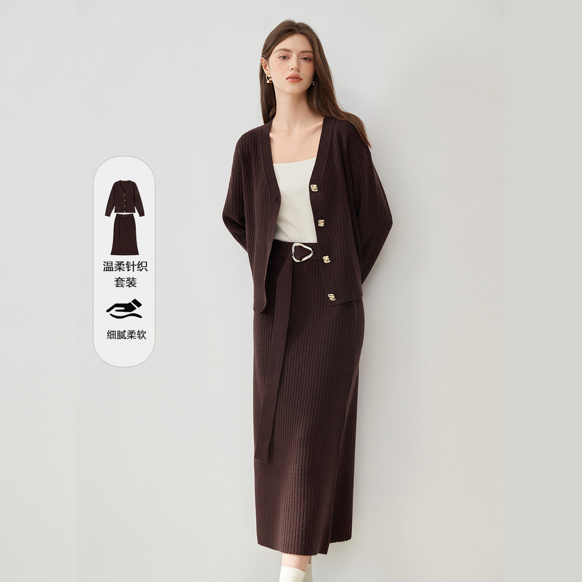 【那时的此刻】春秋淑女绑带开衫提花针织中长连衣裙两件套女套装 916353