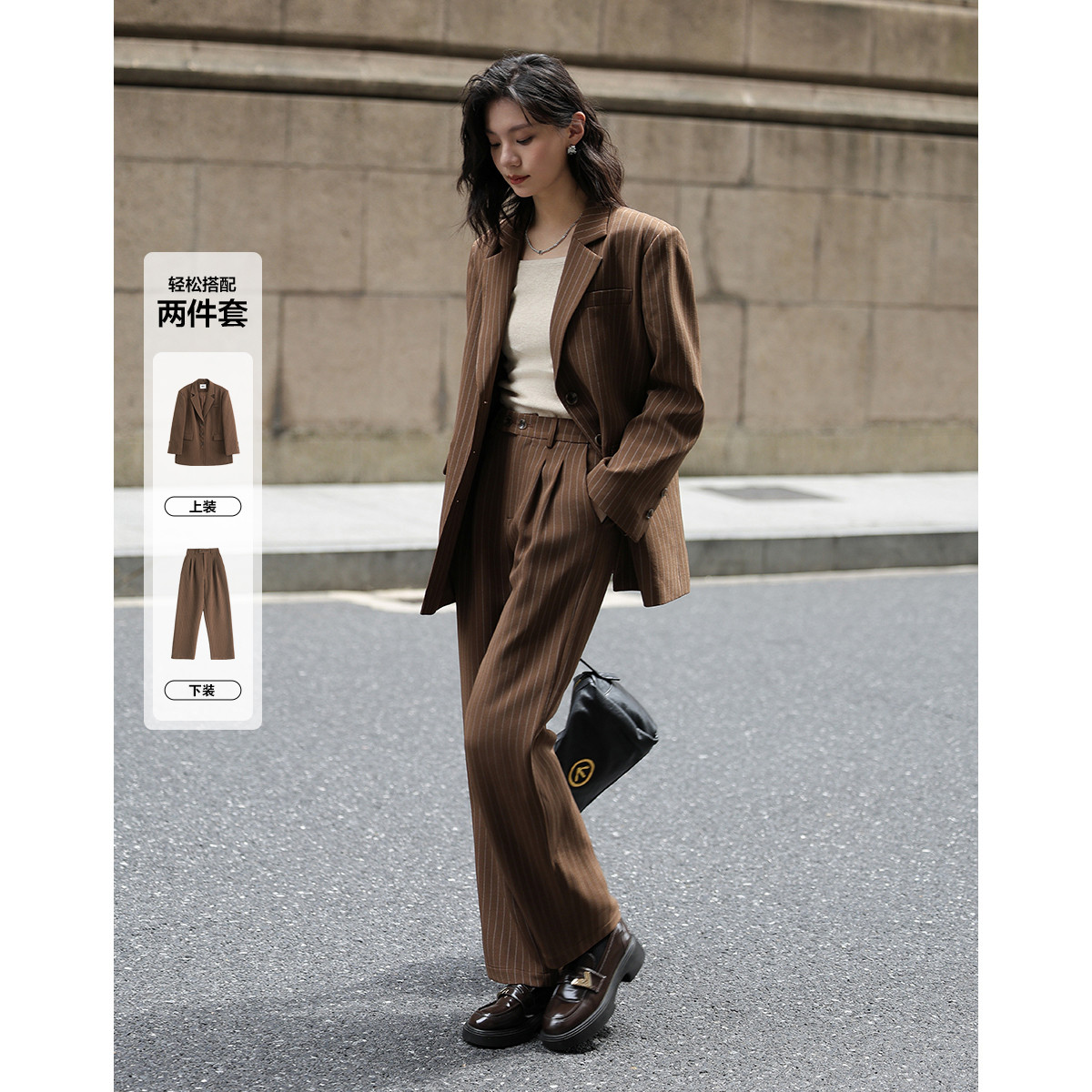 【棕色西装两件套】秋复古风经典条纹西装上衣+休闲裤女 923842