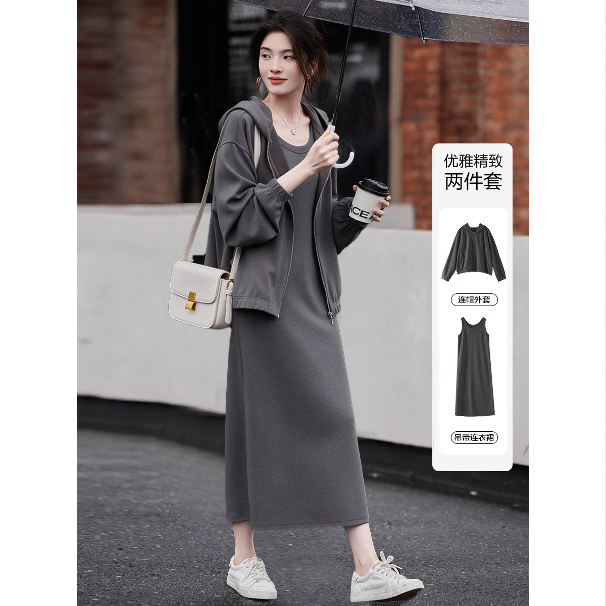 【时髦减龄女式套装】春秋长袖连帽外套开叉背心裙休闲两件套女 293249