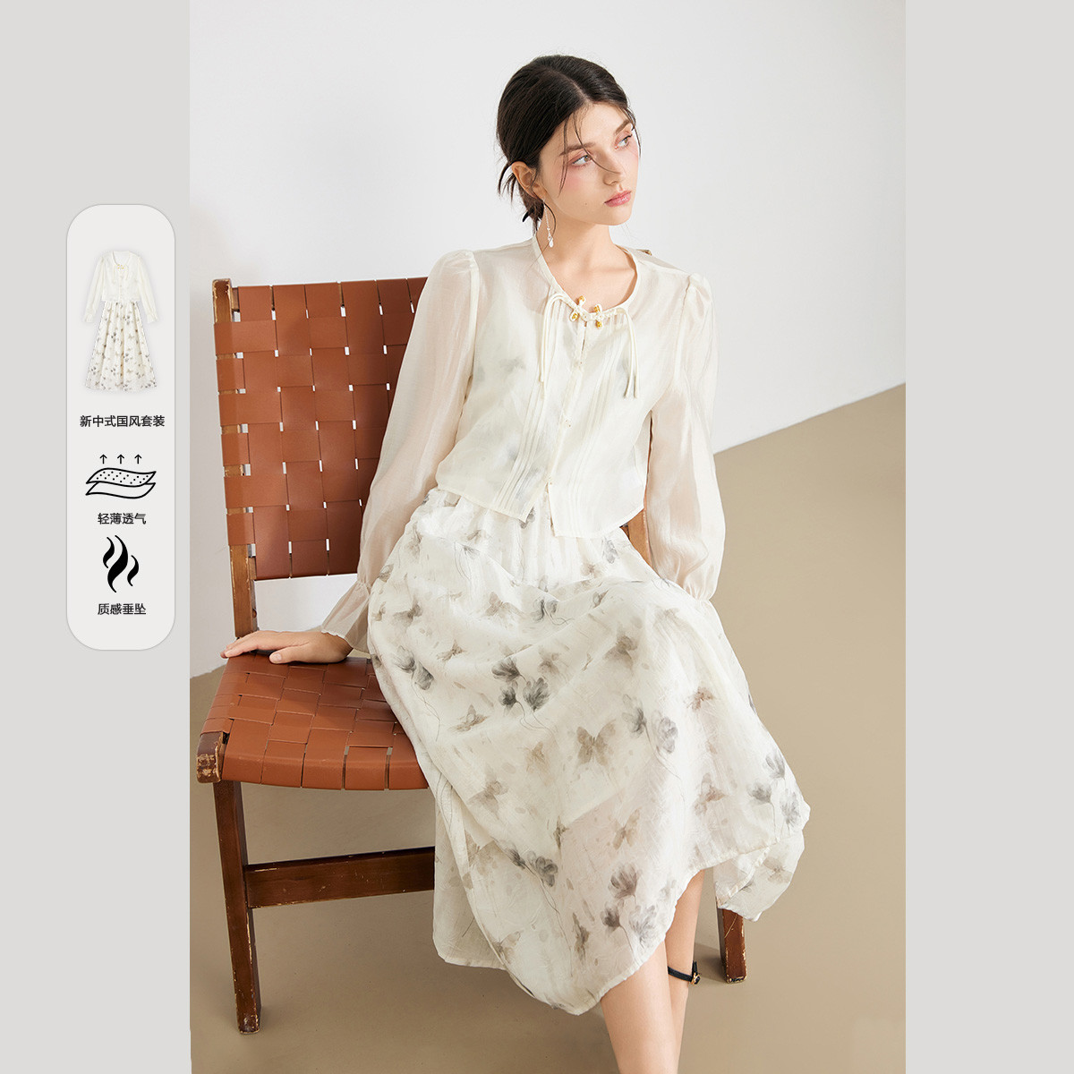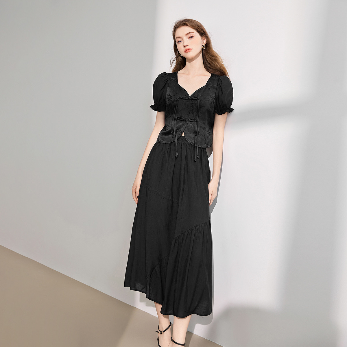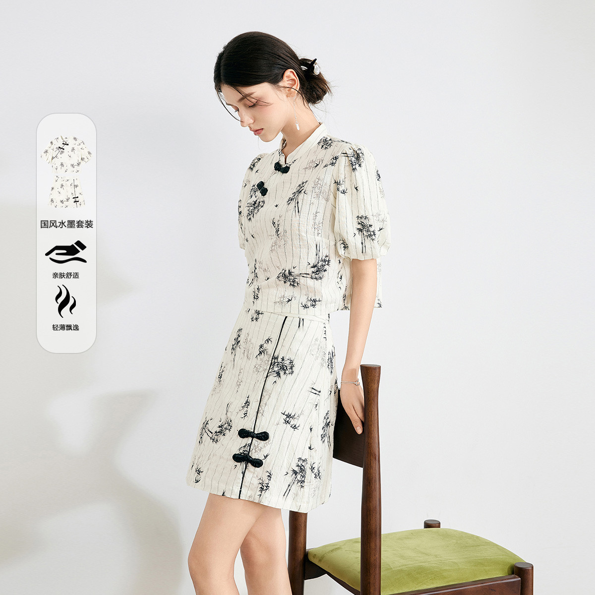 【2024夏季】优雅新中式半身裙两件套女泡泡袖衬衫套装 718228