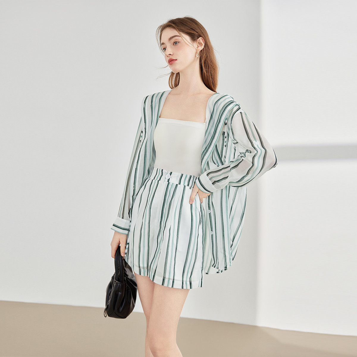 【2024夏季】轻薄条纹衬衫两件套女短裤宽松空调衫套装女 959572